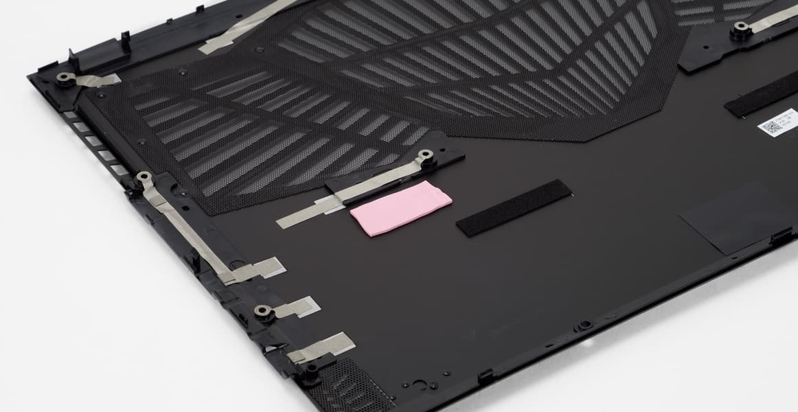 Забор холодного воздуха осуществляется только со стороны нижней части корпуса, где в достаточном количестве расположены закрытые металлической сеткой вентиляционные отверстия, сетка защищает изделие от попадания внутрь корпуса мелких посторонних предметов, ворса, шерсти домашних животных и т.д. Резиновые ножки не очень большие, поэтому ноутбук строго рекомендуется использовать на ровных поверхностях, чтобы не перекрывать доступ прохладных воздушных масс к элементам системы охлаждения.