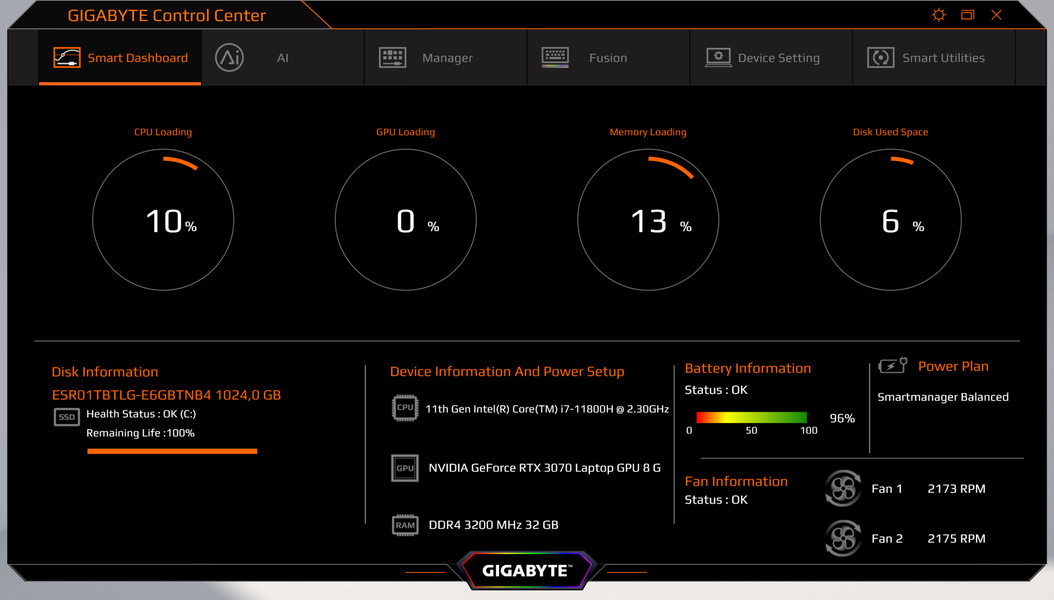 Среди предустановленных приложений безусловный интерес представляет GIGABYTE Control Center. Это простое в использовании ПО для управления большинством ключевых параметров ноутбука, а также для мониторинга состояния системы.