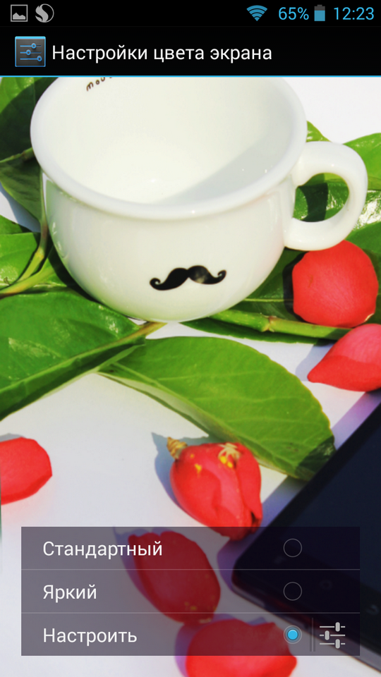 Сложно вспомнить, когда в смартфоне бренда второго эшелона встречалась детальная настройка параметров экрана. Highscreen Boost 2 SE предлагает две «заготовки» – «стандартный» и «яркий». Для любителей более тонкой настройки есть четыре параметра: оттенок, насыщенность, контраст и яркость. Изменения сразу же применяются к текущему тестовому изображению. К сожалению, сохранение пользовательских профилей для последующего выбора из списка недоступно.