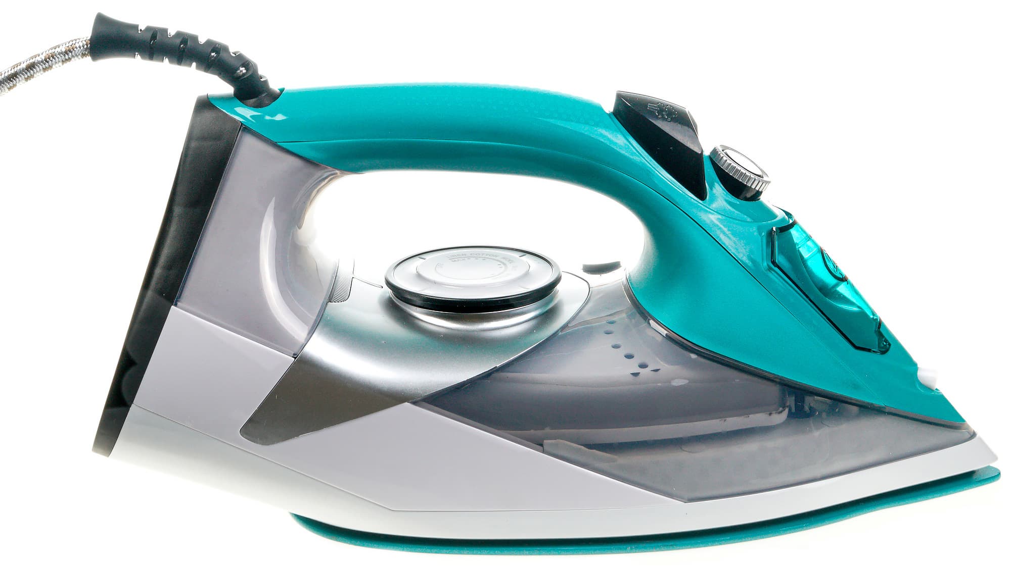 Форма и конструкция утюга Hottek HT-955-007 классическая: подошва, корпус с емкостью для воды, ручка. В оформлении использовано четыре цвета: бирюзовый, белый, светло-серый и серебристый. Несмотря на обилие цветов, утюг не выглядит вычурно или аляповато. Вес можно оценить как средний — прибор не тяжел, но и легким его назвать нельзя.