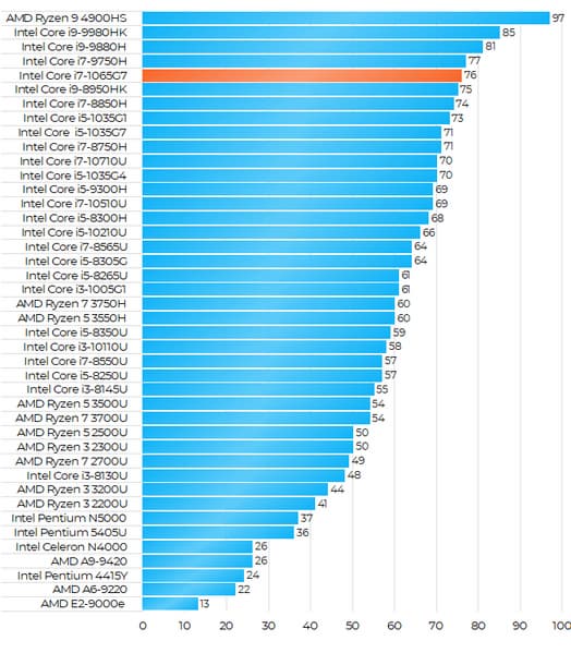 Если сравнивать серию Ice Lake с ближайшими предшественниками, то сильного скачка производительности не обнаруживается, однако главное преимущество i7-1065G7 кроется в другом. Самое важное улучшение Ice Lake – новая интегрированная графика Iris Plus Graphics. В данной версии процессора встроен самый мощный вариант этого видеоядра, название которого (G7) гордо вынесено в название.