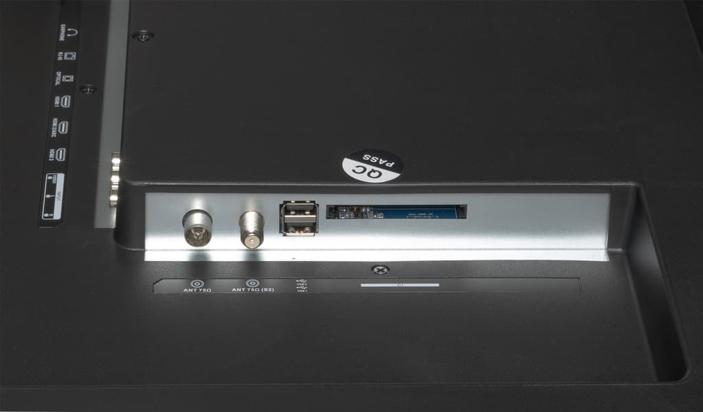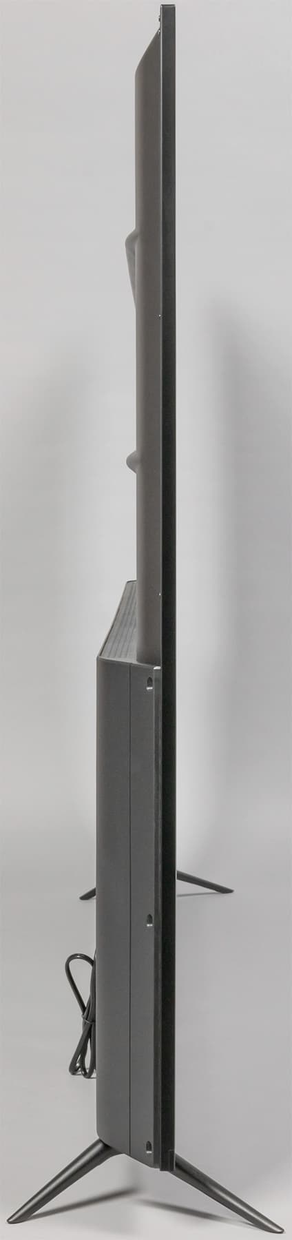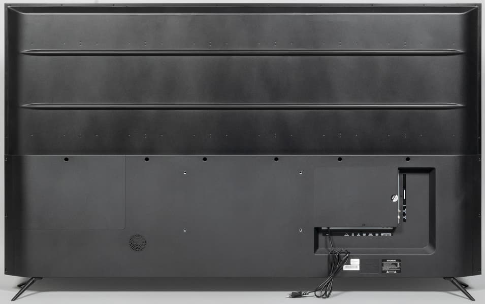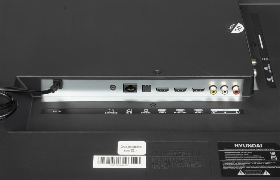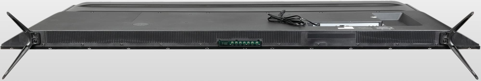 Задняя панель условно в верхней части изготовлена из тонкого листа стали и имеет стойкое черное матовое покрытие. Выступающий назад кожух в нижней части с заходом на нижний торец изготовлен из черного пластика с матовой поверхностью. Интерфейсные разъемы размещены в Г-образной нише на этом кожухе. Часть разъемов направлена вниз, часть вбок. Спереди дотягиваться до разъемов, даже направленных вбок, неудобно. Подключать кабели к разъемам, направленным вниз, еще сложнее. В верхней части телевизор относительно тонкий.