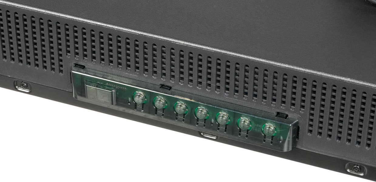 На нижнем торце по центру есть накладка из прозрачного слегка тонированного пластика. Она прикрывает ИК-приемник пульта ДУ и индикатор состояния. Индикатор ярковат. В дежурном режиме индикатор светится красным, в рабочем — не горит, а при приеме команд с пульта — мигает красным. Снизу на этой накладке есть семь механических кнопок, с помощью которых можно ограниченно управлять телевизором без пульта ДУ. Надписи на переднем торце накладки поясняют функции кнопок.