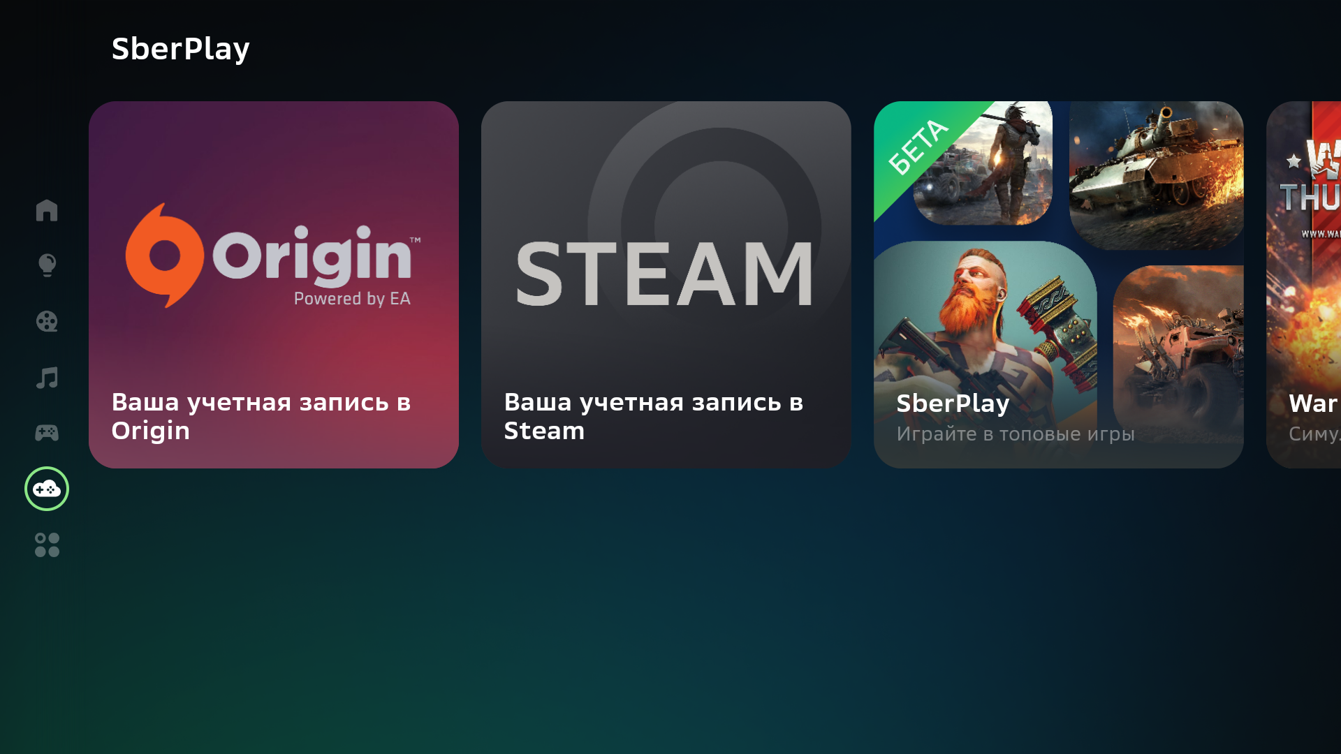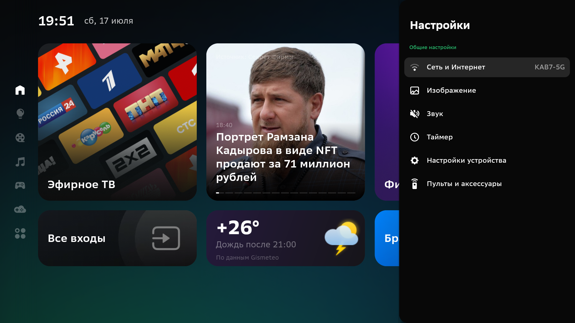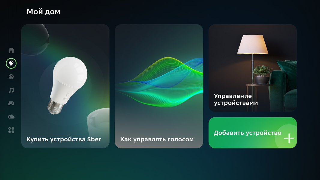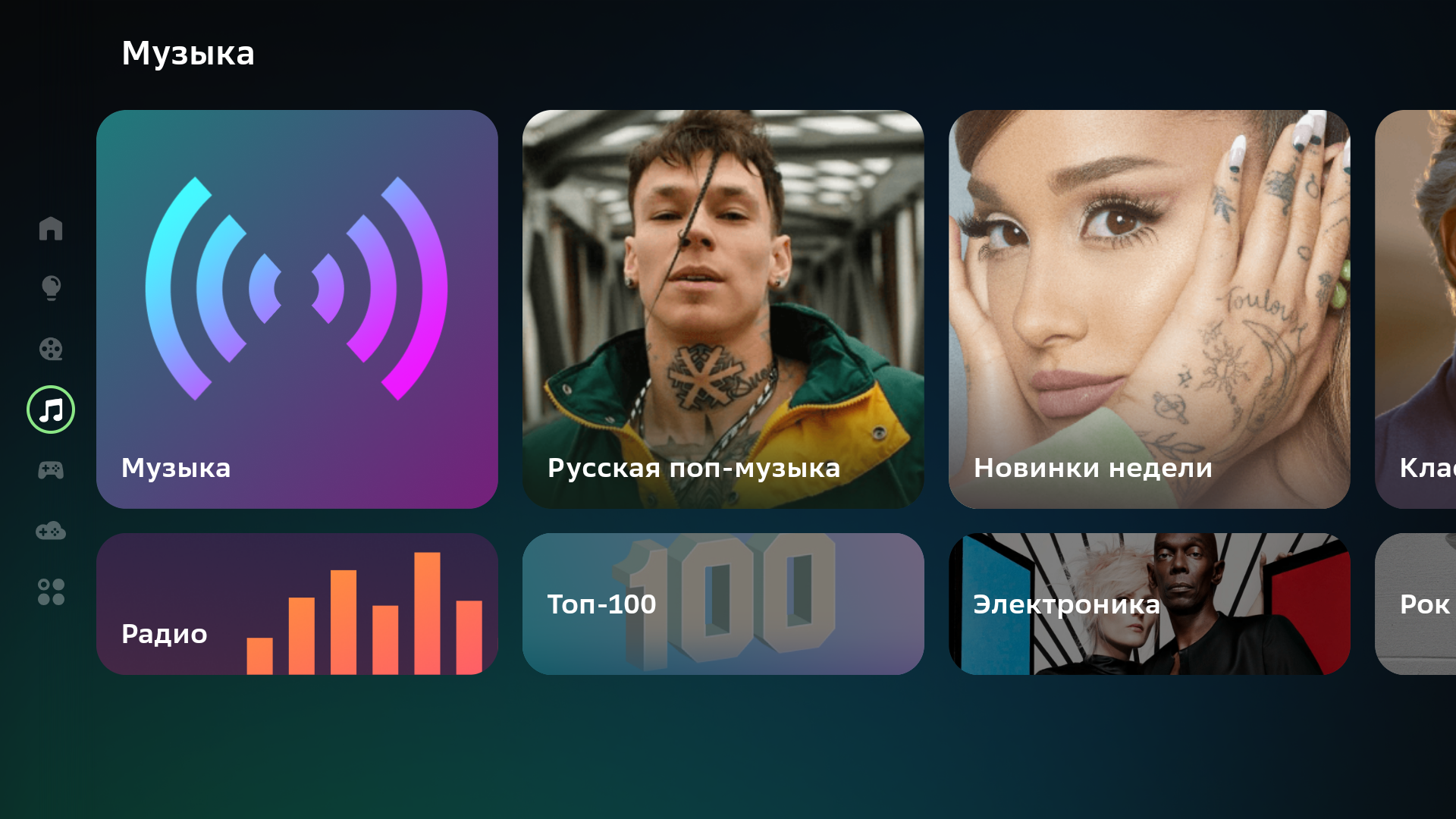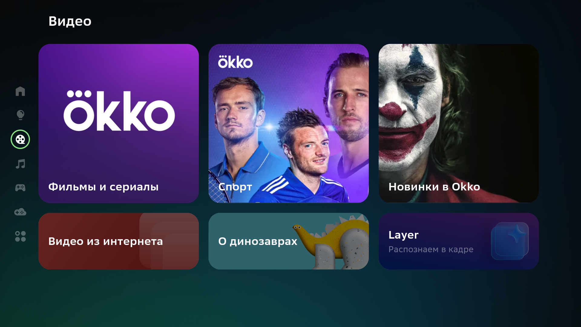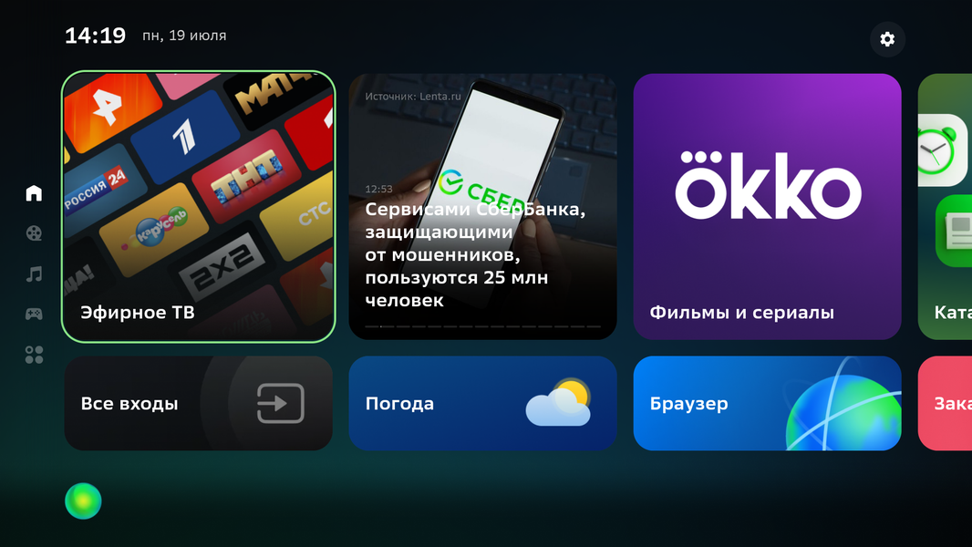 Домашняя страница Салют ТВ имеет простой дизайн – горизонтальные ленты плиток приложений и сервисов занимают большую часть экрана справа, слева находится вертикальный столбец с закладками категорий, а вверху справа притулилась шестеренка входа в меню с настройками.