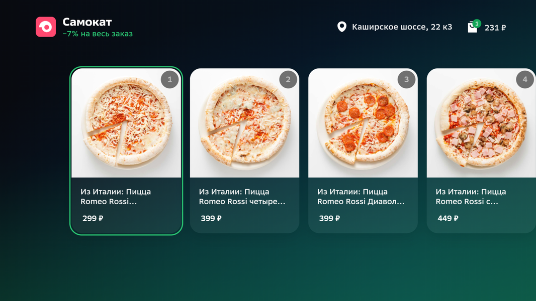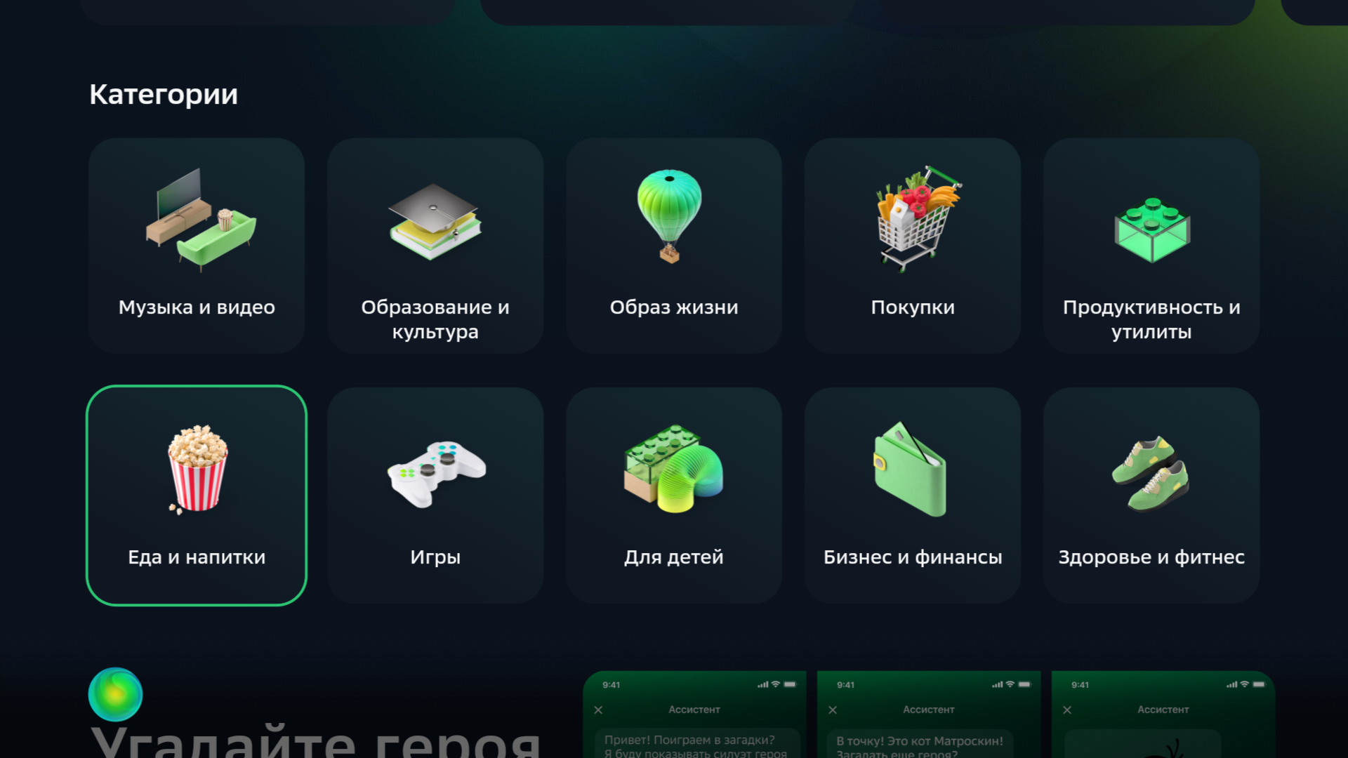 Возможности что-либо изменить на заглавной странице нет. Приложения YouTube в явном виде нет, есть только ссылка на веб-версию для Smart TV в виде плитки с названием Видео из интернета. Из сервисов самым востребованным явно будет заказ еды на дом. Еду можно выбирать из каталога или с помощью голосового помощника, сказав, например, «Хочу пиццу».