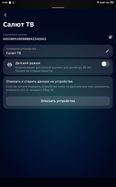 Также ТВ можно переименовать, включить на нем детский режим и отвязать устройство от аккаунта Сбер ID.