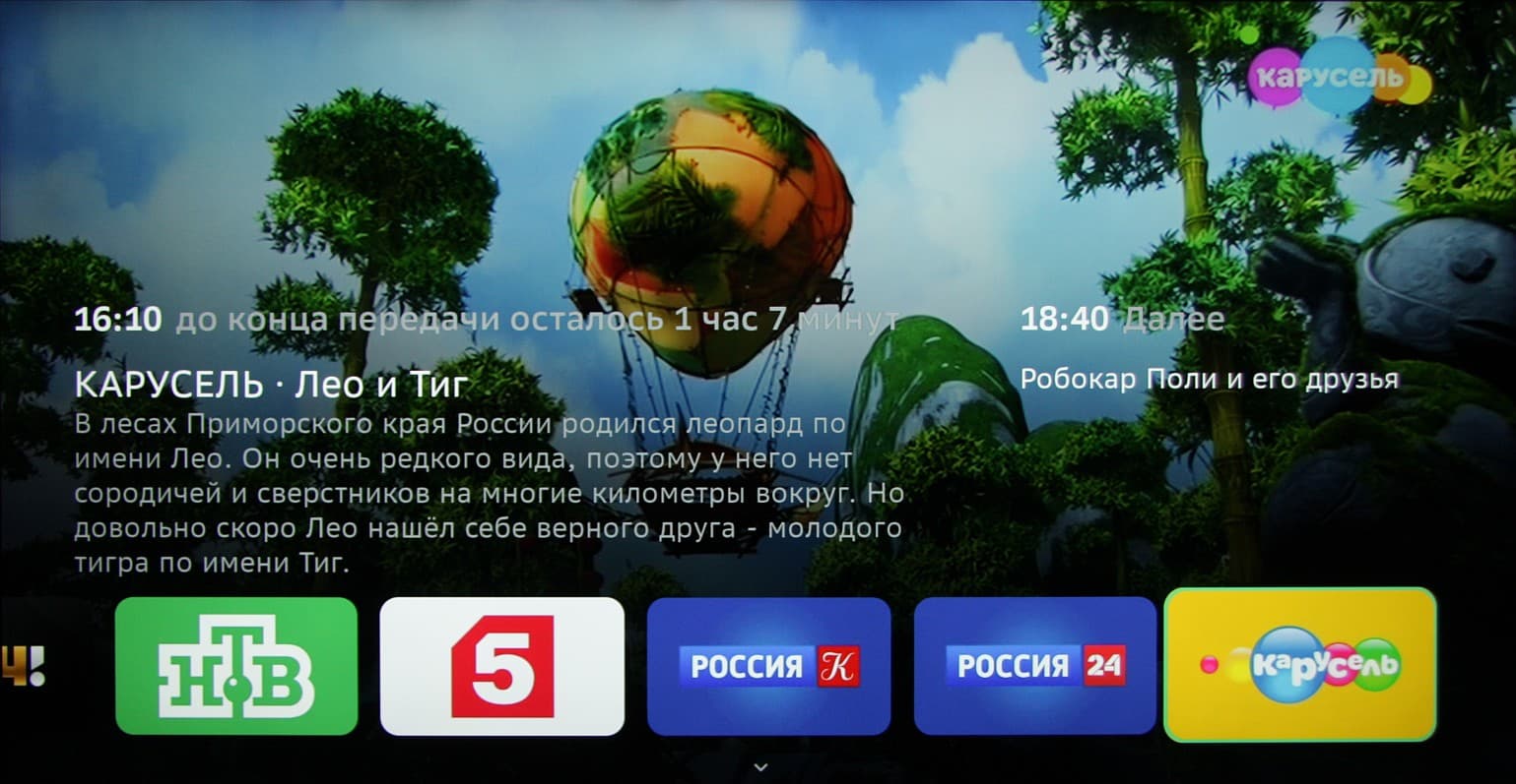 В телевизоре нет продвинутых функций для улучшения качества изображения. Есть очень ограниченная поддержка электронной программы передач — можно посмотреть описание текущей программы и название следующей.
