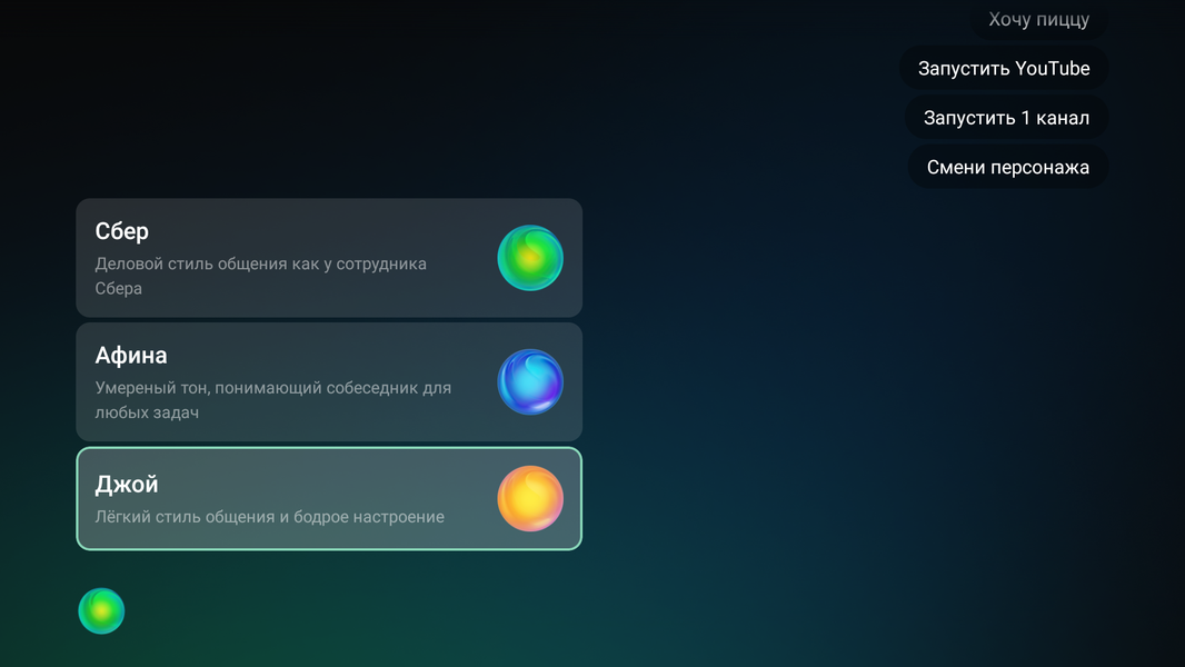 Телевизор слушает пользователя в течение какого-то времени после нажатия на кнопку вызова виртуальных ассистентов на пульте (также можно нажать на кнопку [Win] на подключенной клавиатуре). Это удобнее, чем удерживать кнопку нажатой. Звук самого ТВ при этом не приглушается, но, если произносить команды достаточно громко, держа микрофон (то есть пульт) близко ко рту, то команды хорошо распознаются даже в шумном окружении. Голосовой помощник доступен в виде трех персонажей, выбрать из которых можно, произнеся команду «Смени персонажа».