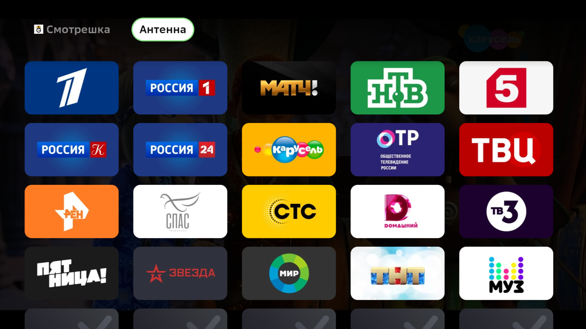 Функций записи ТВ-программ и режима приостановки во времени (Time shift) нет, нет и поддержки Teletext. Под плиткой с названием Эфирное ТВ на заглавной странице спрятано два списка: каналы Смотрешки и каналы, действительно обнаруженные в эфире/кабеле.