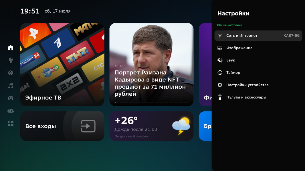 Удобно, что меню с настройками вызывается напрямую в любом режиме работы телевизора долгим нажатием на кнопку с изображением домика. Заглавную страницу можно просто прокручивать вверх вниз (а горизонтальные ленты вправо-влево, если они не помещаются на экране), а можно выбирать нужную категорию в столбце закладок. Вид при выборе первой закладки показан выше, продемонстрируем последовательно следующие категории: