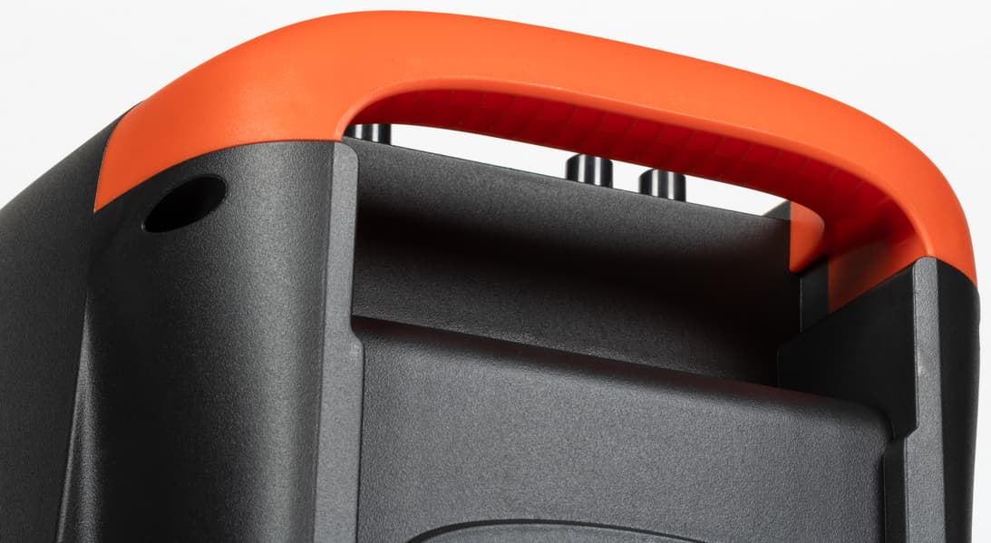 Ручка для переноски выделена цветом, на верхнюю панель вынесены органы управления, разъемы для подключения и небольшой экран.