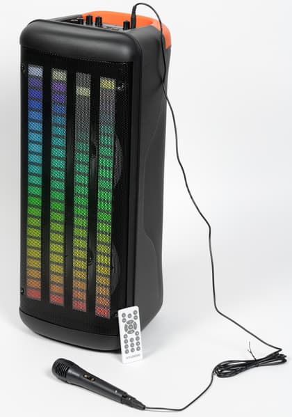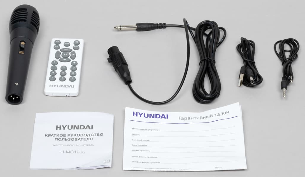 В комплект поставки помимо самой колонки входят микрофон для пения караоке и кабель XLR-Jack 6,3 мм для его подключения, кабель питания, кабель 2×мини-джек для проводного подключения к источнику, инструкция и гарантийный талон.