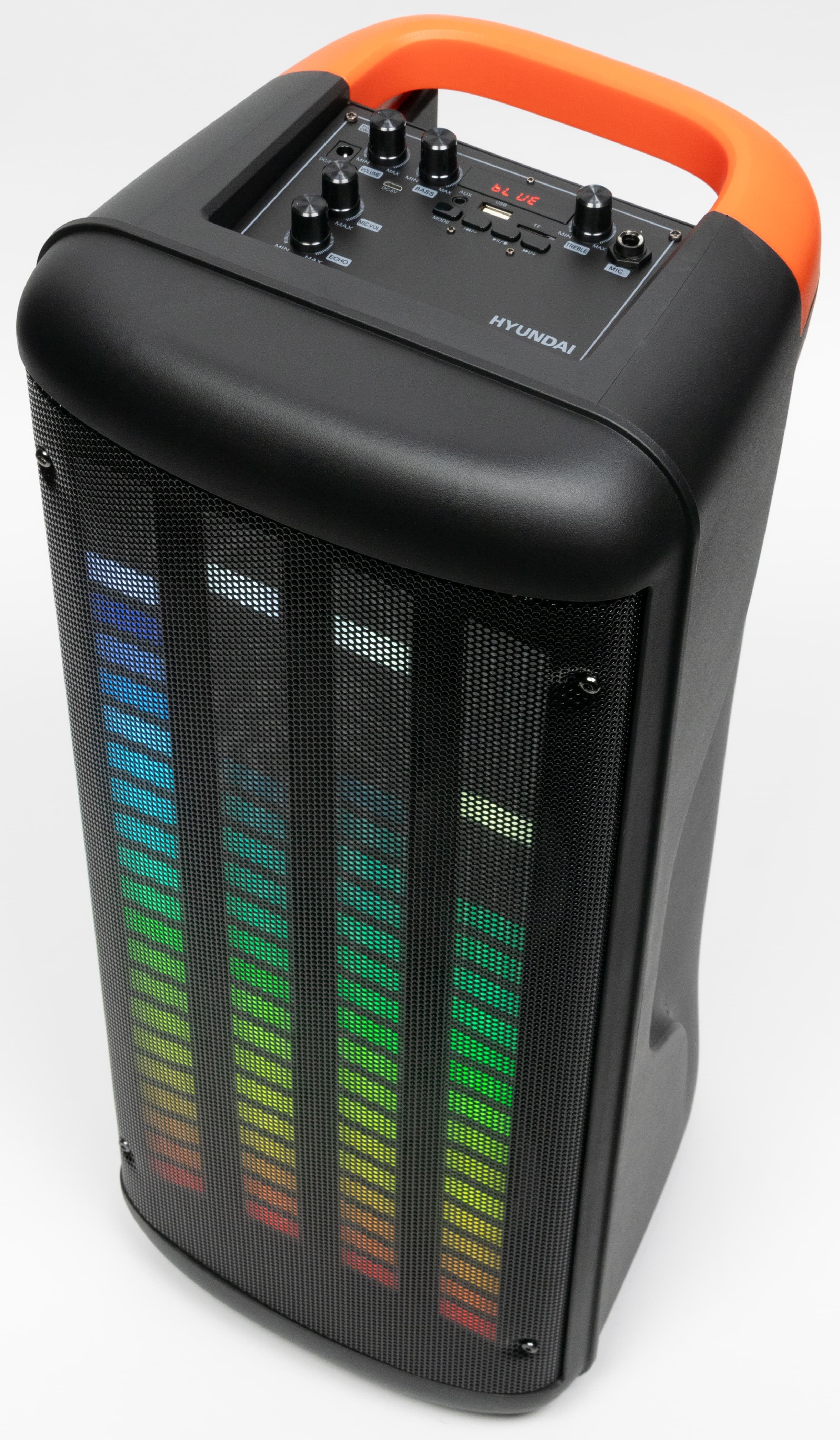 Компания Hyundai представила свою версию автономных колонок для вечеринок, которые также называют «патибоксами». Рецепт классический: пара крупных динамиков плюс твитер, автономная работа до 10 часов, подключение к источнику посредством Bluetooth и кабеля, встроенные плеер и радиоприемник, пульт дистанционного управления, вход для микрофона, позволяющего петь караоке. Отличительной чертой устройства стала эффектная подсветка в виде столбиков эквалайзера.