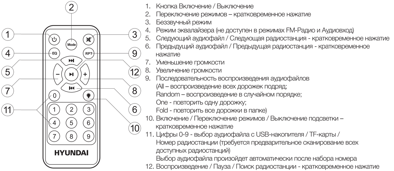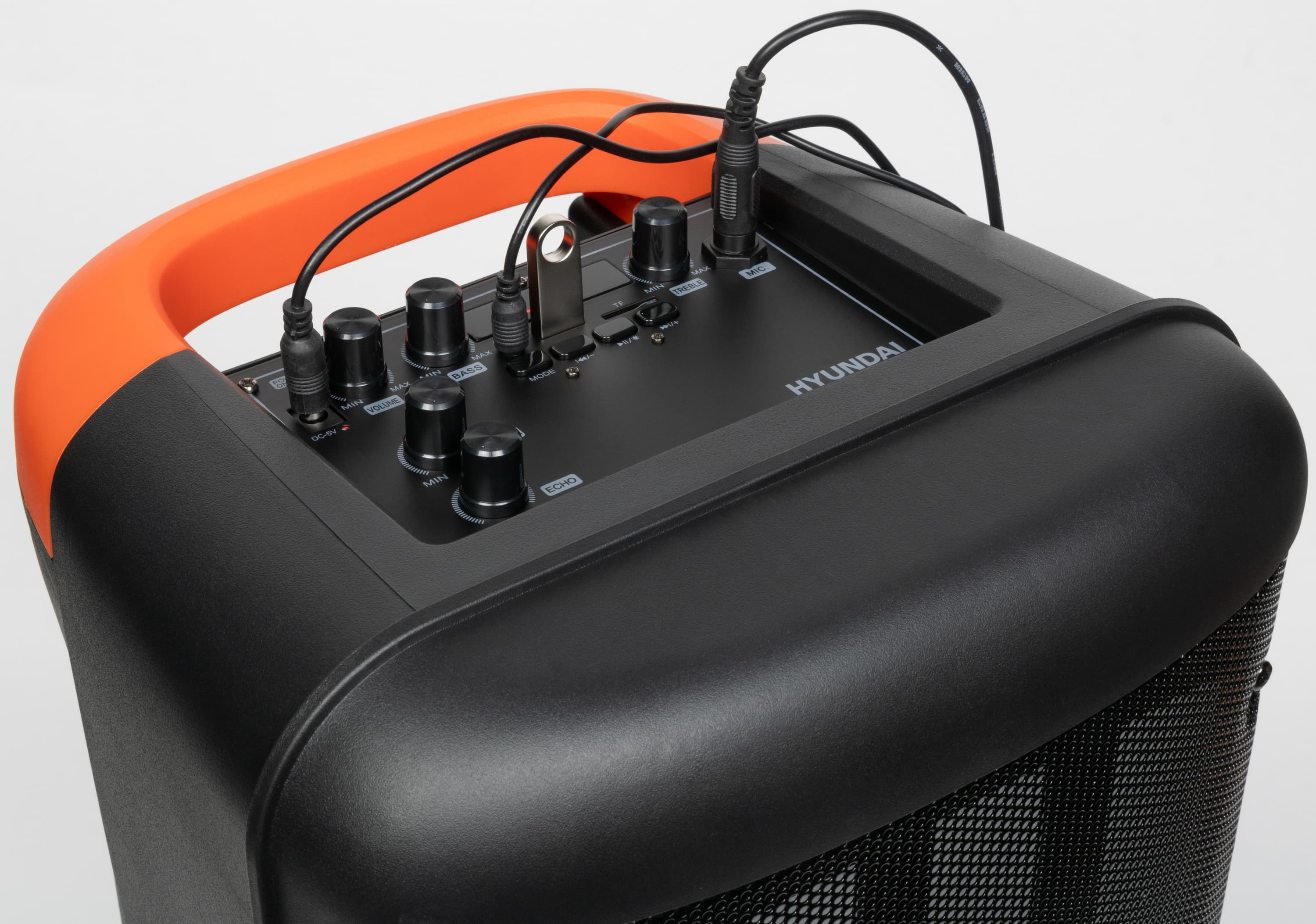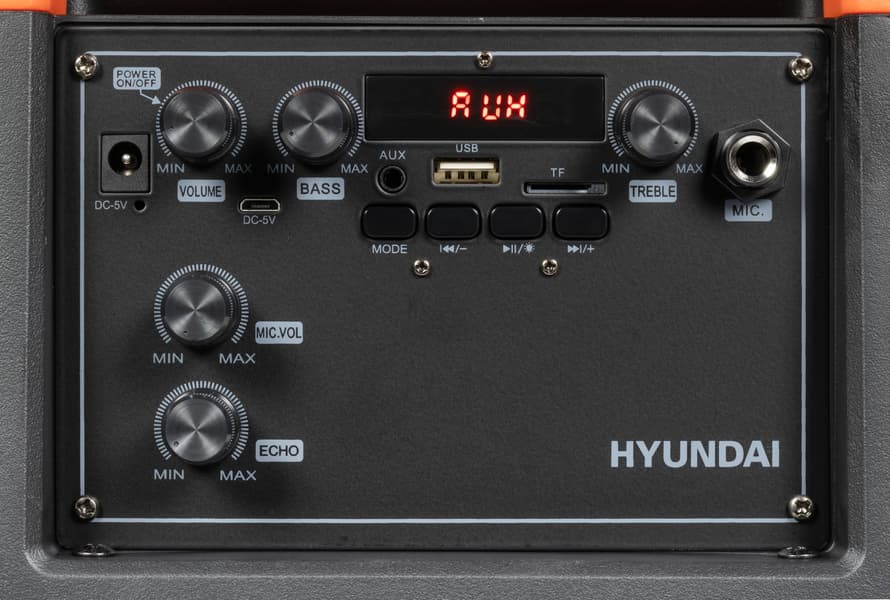 В отличие от ряда других производителей, Hyundai указывает мощность как PMPO – 100 Вт, так и RMS – 40 Вт. Громкости колонки хватит для озвучивания помещения средних размеров или небольшой вечеринки на свежем воздухе. Особенности звучания колонки характерны для рассматриваемого форм-фактора: звук ориентирован на прослушивание танцевальных композиций и пение караоке. Регуляторы низких и высоких частот, размещенные на верхней панели, позволяют немного подстроить профиль звучания под вкусы пользователя. В режимах Bluetooth-подключения и USB-плеера также доступны звуковые профили, активируемые посредством клавиши на ПДУ – есть возможность выбрать один из них, после чего дополнительно подкорректировать звук с помощью регуляторов.