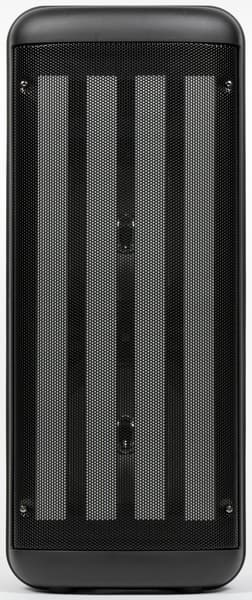 Передняя панель полностью закрыта металлической сеткой, за которой находятся элементы подсветки. На задней стенке размещены отверстие фазоинвертора и небольшая наклейка с краткой информацией об устройстве.