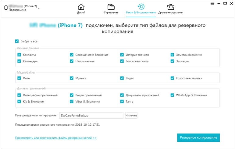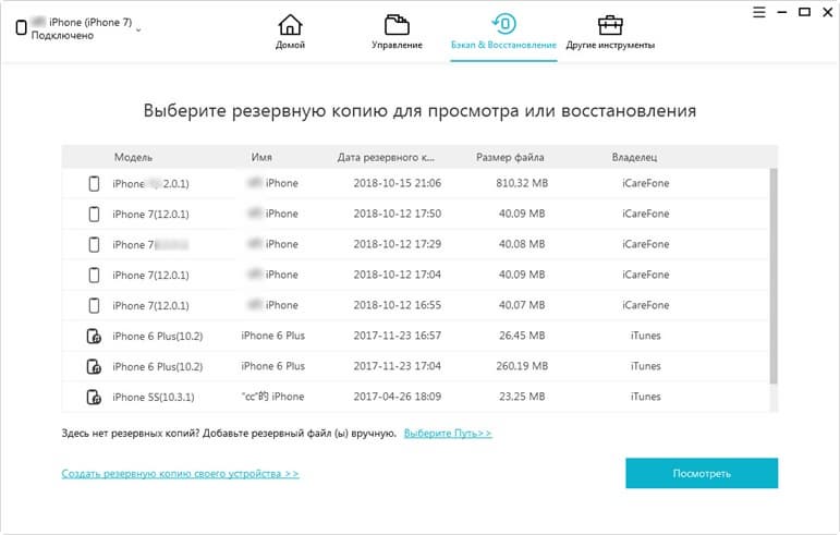 В iCareFone можно выбрать нужный контент из большого списка, после чего еще и выбрать папку для сохранения бэкапа. Процесс резервного копирования небыстрый и занимает больше часа. Затем в интерфейсе iCareFone можно будет выбрать созданный бэкап для восстановления. Интересно, что приложение видит бэкапы, сделанные iTunes, но iTunes не видит бэкапы, сделанные в iCareFone. Что, впрочем, не имеет значения, так как результат восстановления устройства как у iTunes, так и у iCareFone одинаковый. Кстати, с помощью приложения можно просмотреть содержимое резервной копии iTunes и выборочно достать оттуда данные.