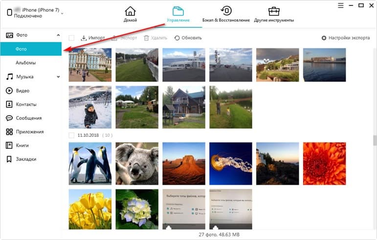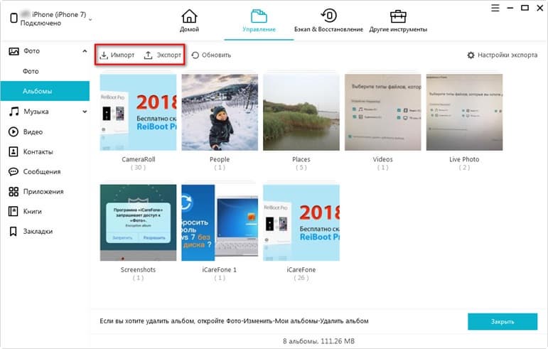 Во вкладке «Управление» можно увидеть открытую для доступа извне файловую систему iOS, контент в которой разделен по типу: фотобиблиотека, музыка, кино, приложения, контакты, книги, заметки и сообщения. Получить полный доступ ко всей файловой системе невозможно из-за ограничений Apple — обойти защиту можно только с помощью джейлбрейка, но в наше время ситуация с ним уже не так однозначна. Джейлбрейк iCareFone не делает.