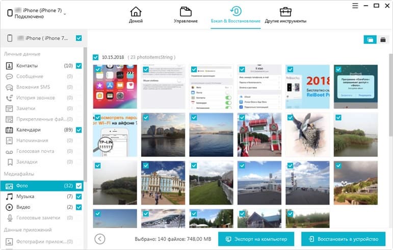 Контент из отсортированных категорий можно посмотреть, выбрать отдельные элементы, перенести их на компьютер или удалить. Это очень удобно, если вы хотите скопировать на компьютер несколько сотен фотографий из отпуска в исходном качестве — делать это с телефона или тем более через iTunes было бы невероятно неудобно.