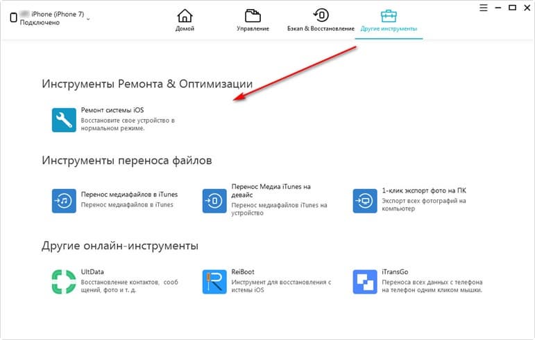 Последняя вкладка iCareFone посвящена восстановлению системы. Во времена, когда джейлбрек практически ушел из жизни владельцев iOS-устройств, необходимость в функции восстановления уменьшилась. Но если вы все же экспериментировали со своим гаджетом, и теперь iPhone не загружается (например, показывает яблоко и перезагружается), iCareFone сможет скачать и восстановить прошивку гаджета, сохранив весь контент на нем.