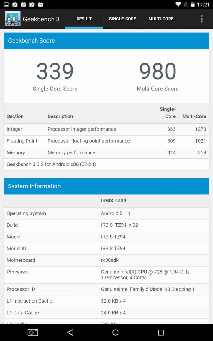 В Irbis TZ94 установлен новый 4-ядерный процессор Intel® Atom™ x3-C3230RK с частотой x86-ядер до 1,2 ГГц, поддерживающий 64-битные вычисления. Для обработки графики используется видеочип Mali-450 MP4 – популярное решение, которое появилось еще в начале 2014 года, но не растеряло актуальности. В тесте AnTuTu процессор выдает 18-20 тысяч баллов, что выше, чем у аналогов на ARM.