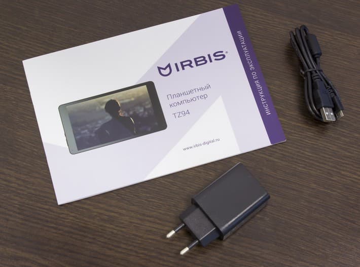 Разработчики бюджетных планшетов, как правило, стараются «удивить» пользователя минимализмом комплектации, и Irbis с его TZ94 – не исключение. В коробке было обнаружено только зарядное устройство, кабель USB и «макулатура» (гарантия, инструкция). Сама коробка выполнена в приятной бело-фиолетовой расцветке.