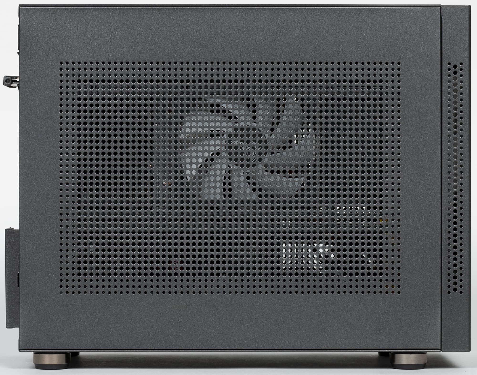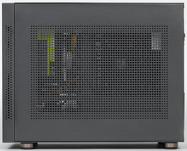 Размеры вполне компактные для minitower – 30×18,5×39 сантиметров (и это включая выступающие элементы), а дизайн совершенно нехарактерный для современных корпусов подобного типа: нет ни одного окна с прозрачной вставкой, большого (во всю стенку) или маленького.