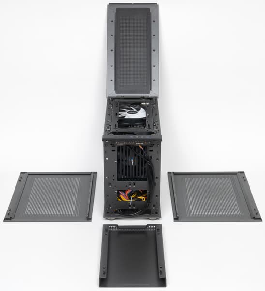 Надо отметить и минимальное количество винтов, используемых для крепления внешних панелей, которые в основном держатся защёлками. Сказанное в полной мере касается фронтальной и боковых крышек – они снимаются без отвёртки, и лишь верхняя и нижняя дополнительно зафиксированы винтами (по одному на задней кромке у каждой из них).