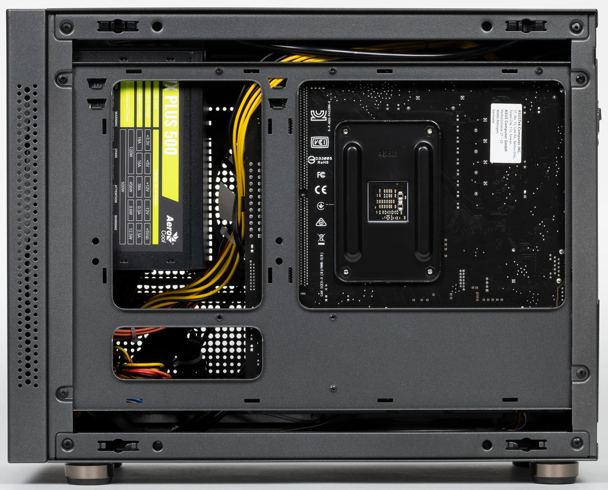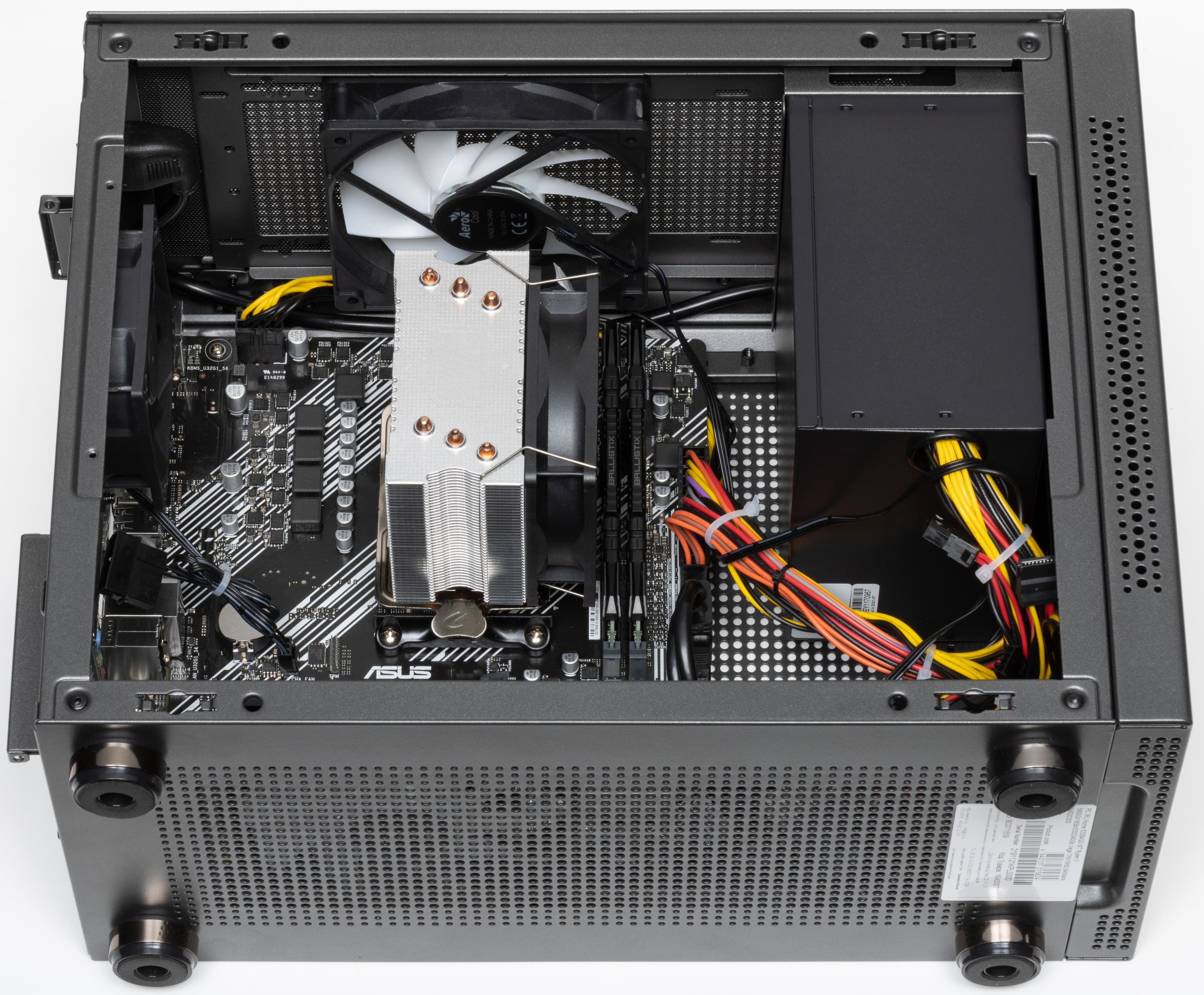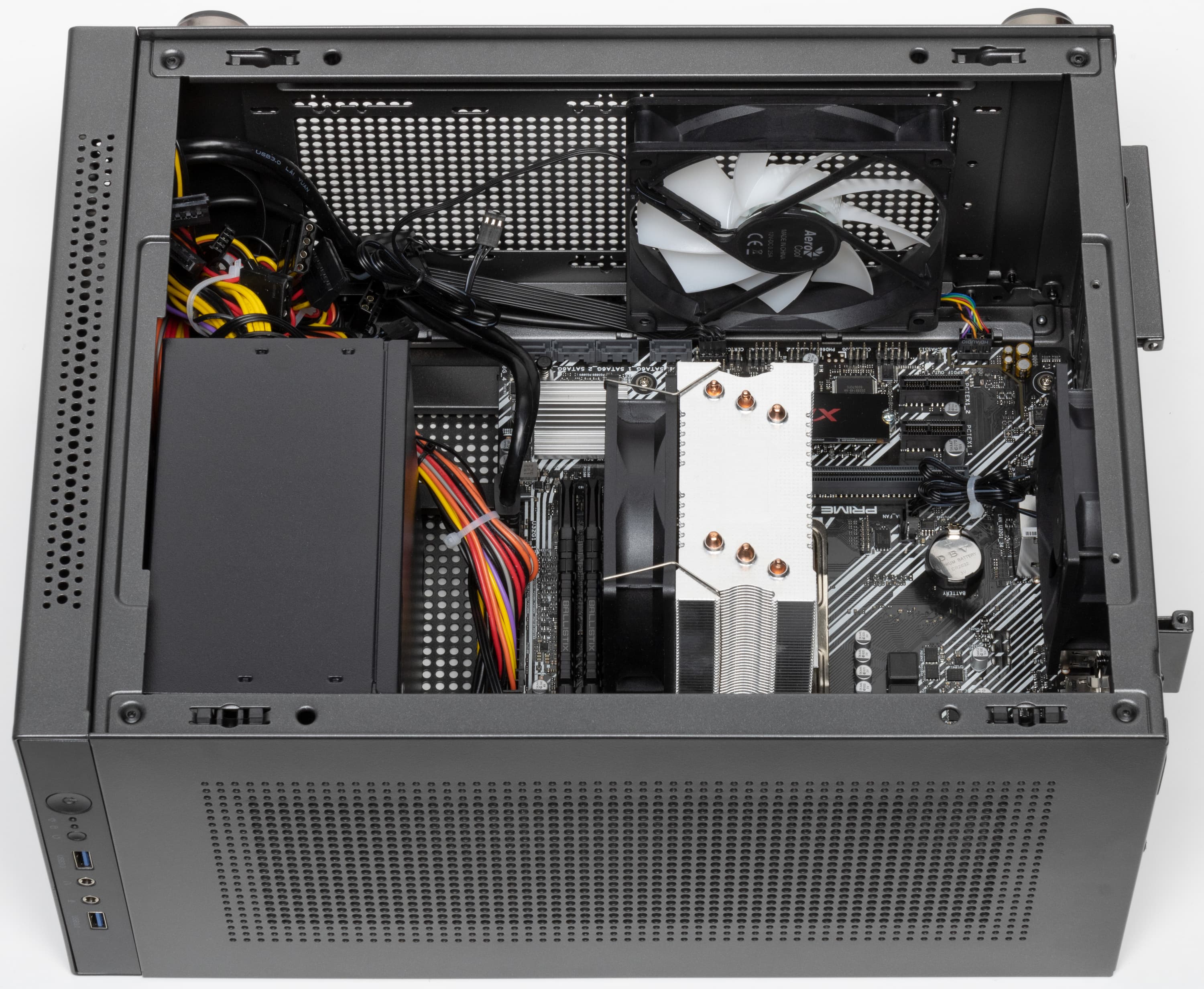 В качестве источника питания использован Aerocool VX Plus 500 (цифры обозначают мощность в ваттах; еcть активный PFC), который относится к бюджетным моделям и часто используется сборщиками ПК. Он размещён вертикально в передней части корпуса таким образом, что встроенный в него нагнетающий вентилятор обращён к лицевой панели, а выброс прошедшего через "потроха" БП воздуха направлен вверх. Разъём корпуса ПК для подключения к сети переменного тока расположен стандартно, на задней стенке, и с блоком питания он соединяется специальным кабелем, аккуратно проложенным в верхней части шасси.