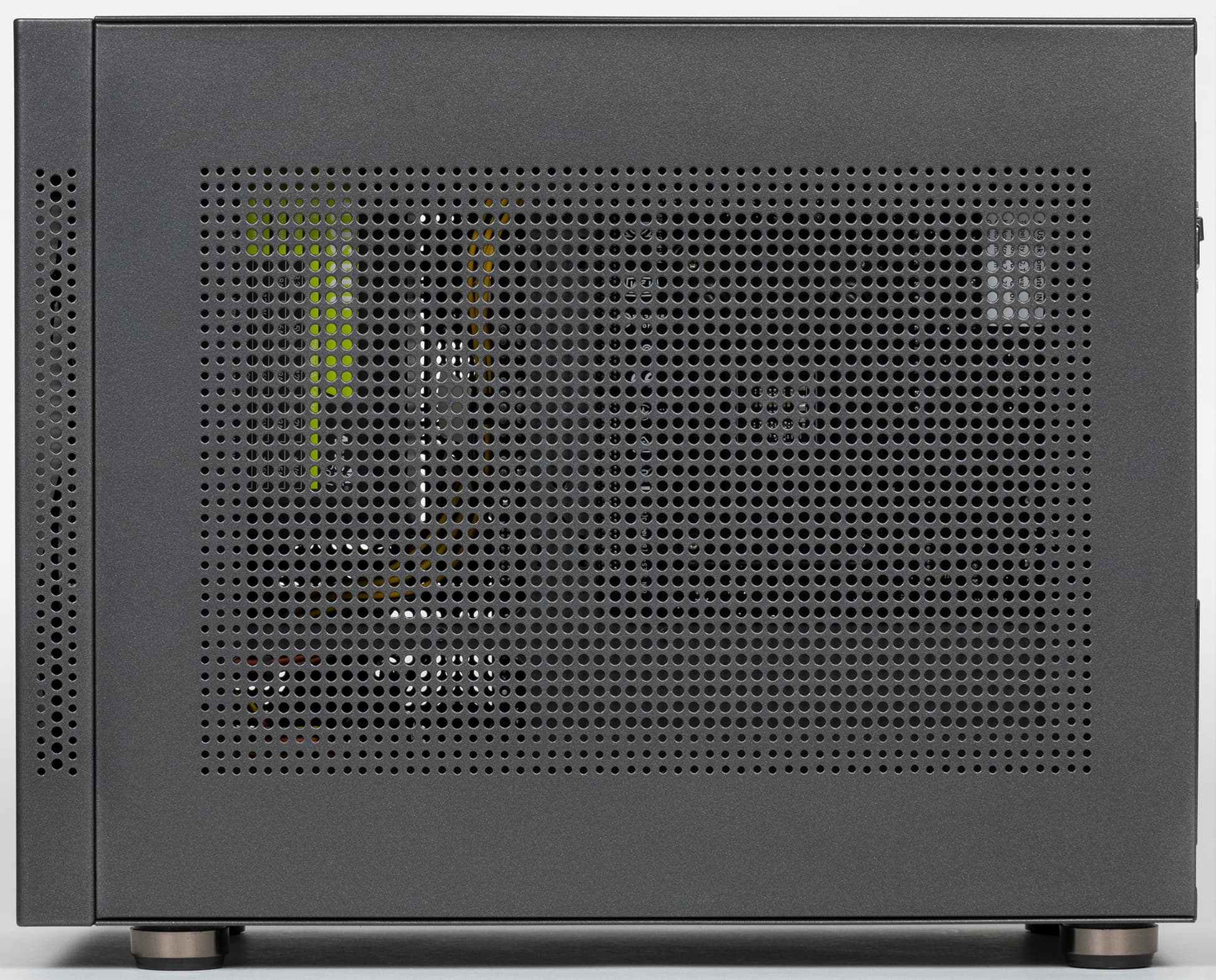 Эти три вентилятора оснащены RGB-подсветкой, которая не регулируется и не отключается, поскольку подключены они к разъёму Molex блока питания (соответственно нет и контроля скоростей вращения). При этом подсветку видно через множество отверстий в левой и верхней крышках.