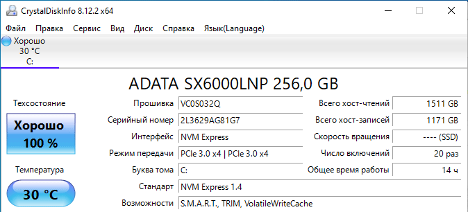 | Накопители | 1 × SSD 240 ГБ (ADATA SX6000LNP-256GT-C, NVMe, PCIe 3.0 x4) |