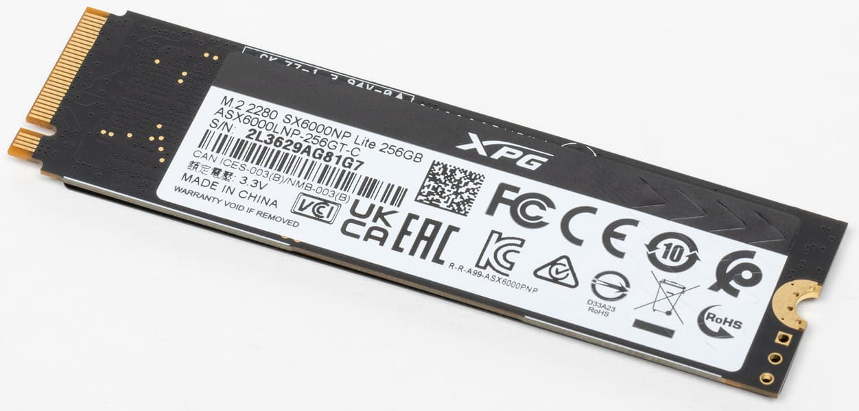 Накопитель один – SSD форм-фактора М.2 2280 (на системной плате есть крепление для 2260 и 2242). Использована модель ADATA SX6000LNP с интерфейсом PCIe 3.0 x4, линейные чтение/запись: до 1800/1200 МБ/с.