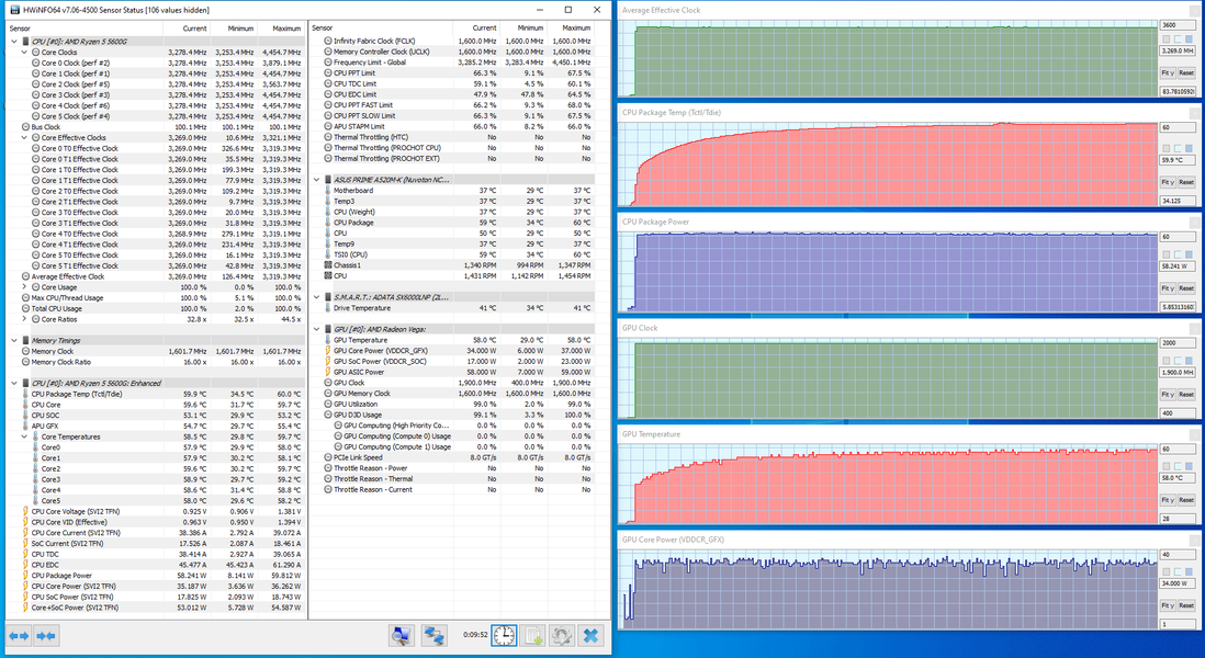 И тут ничего критического не наблюдается: потребление повыше, но не сильно, температура немного увеличилась по сравнению с первым случаем, и скорость вентиляторов возросла процентов на десять-двенадцать.