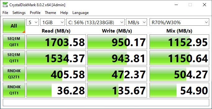 Тесты накопителя подтверждают, что используемый SSD ADATA SX6000LNP не относится к рекордно быстрым: