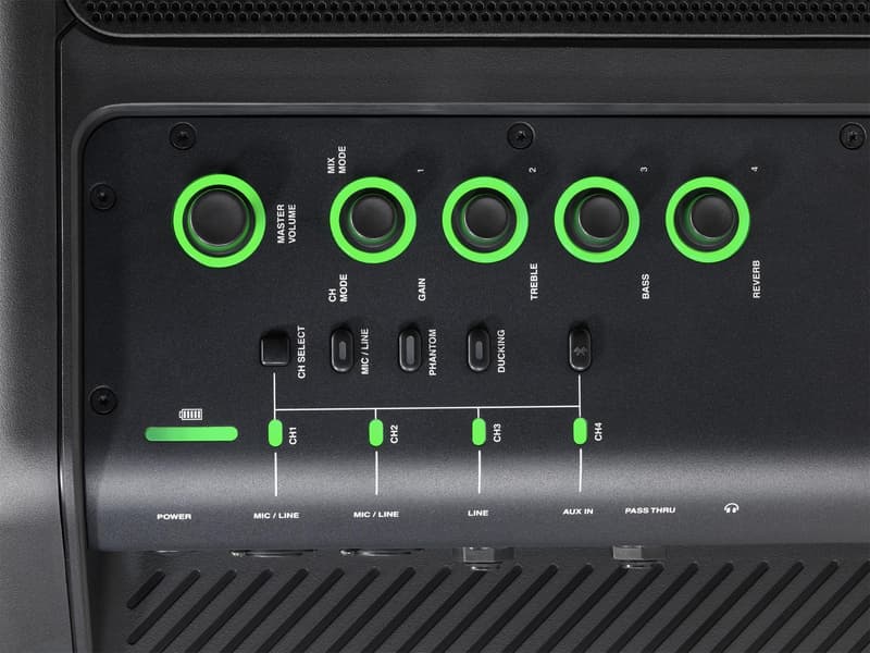 К колонке можно подключить до четырех источников звука как с помощью кабелей, так и по Bluetooth. В JBL EON ONE Compact уже встроен микшерный пульт, который поддерживает алгоритмы обработки сигнала Lexicon и dbx. Сигнал от микрофонов можно подавать на первые два канала через XLR/TRS-разъемы. Причем на первый вход можно подать также и фантомное питание 48 В. На третий канал сигнал поступает через Hi-Z вход с TRS-разъемом. Четвертый канал используется для подключения внешних источников звука через AUX или Bluetooth.