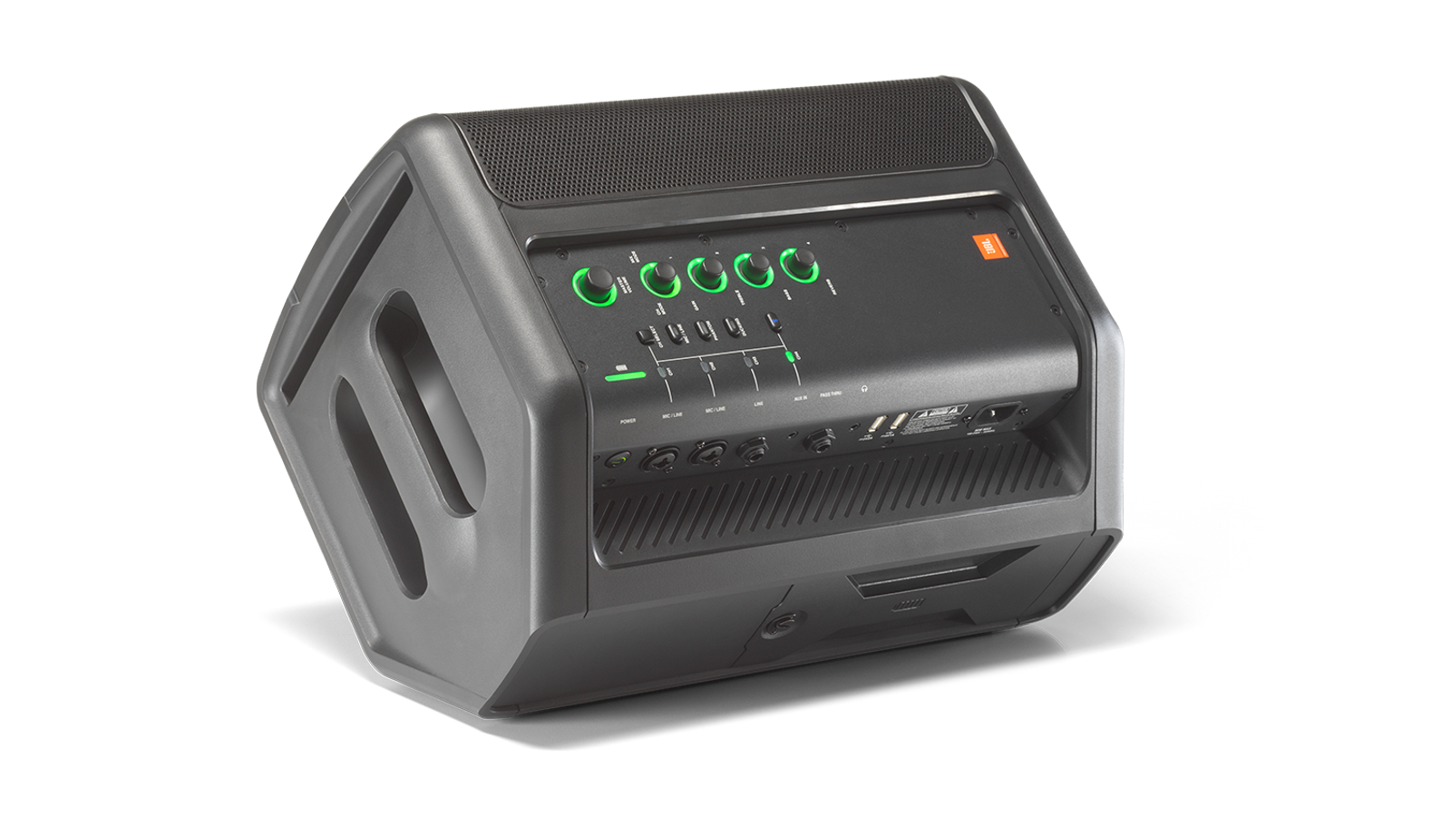 Модель выполнена в классическом для активной акустической системы литом корпусе из пластика. Сверху размещена большая ручка для переноски, а также ниша для установки планшета — на случай если понадобится тонкая настройка звука через программный интерфейс JBL Compact Connect.