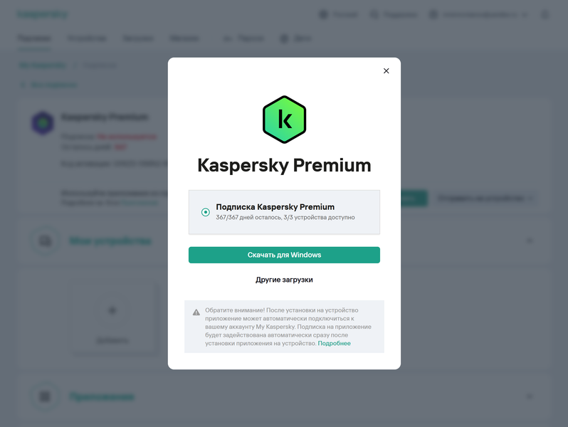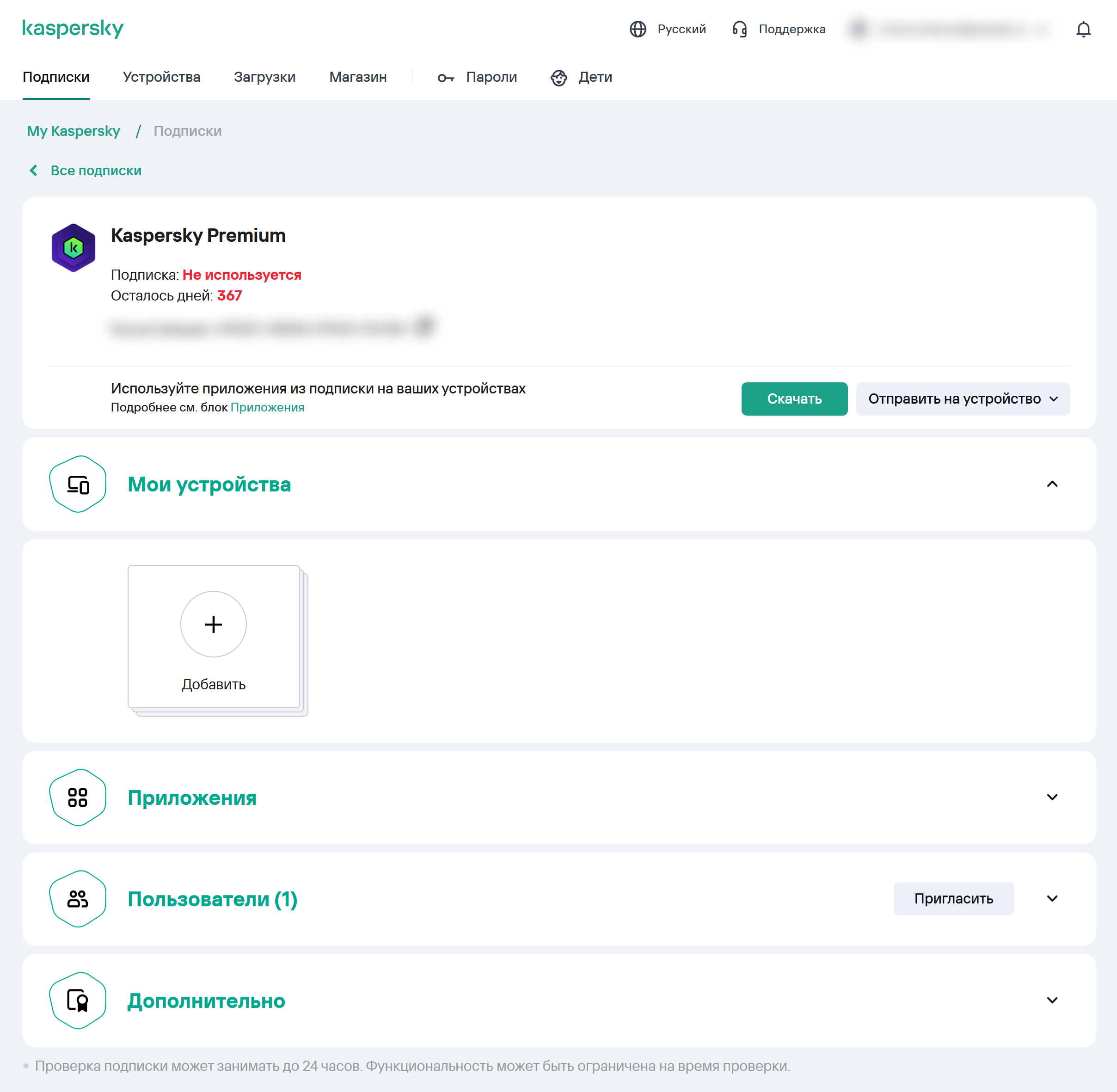 На странице подписки в личном кабинете My Kaspersky отображаются все устройства и приложения. Там же можно добавить новых пользователей, если Kaspersky Premium используется семьей. У нас пока список устройств пуст – это мы сейчас и исправим. Первым делом, конечно, скачаем и установим приложение для Windows.