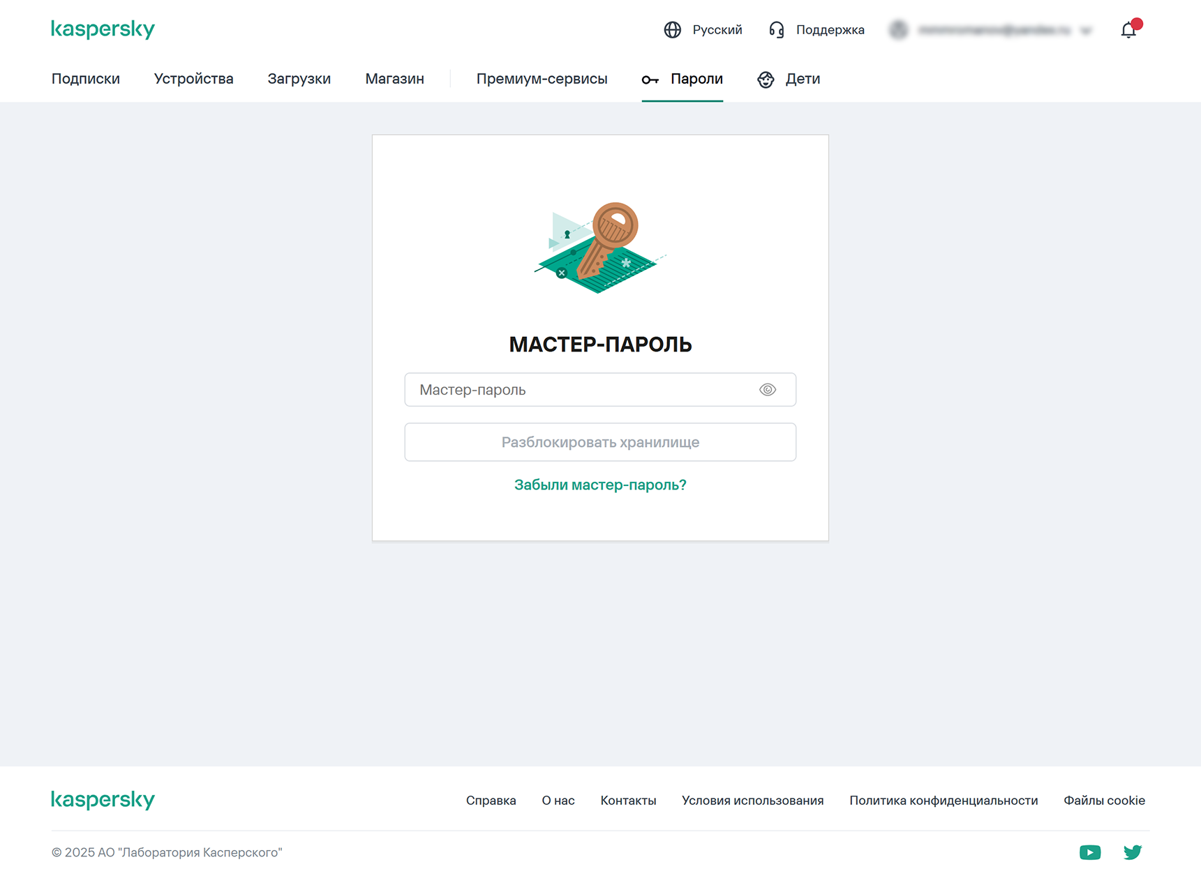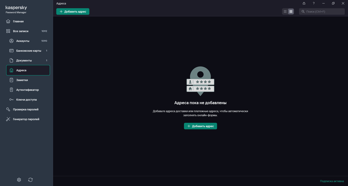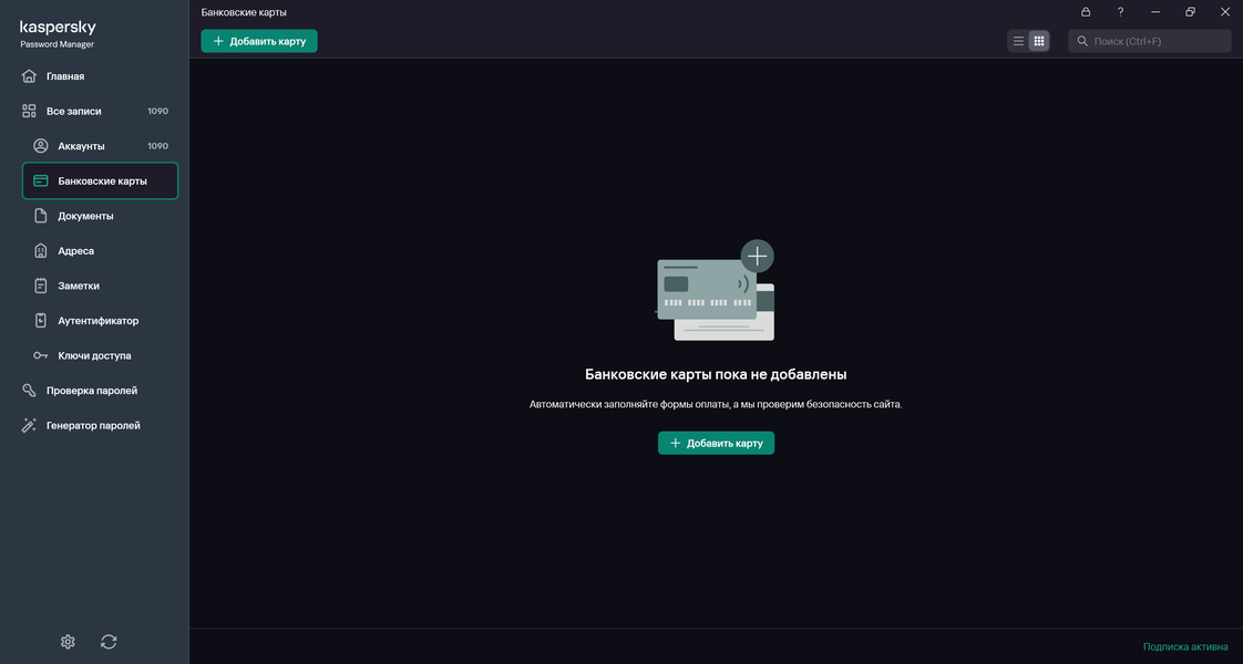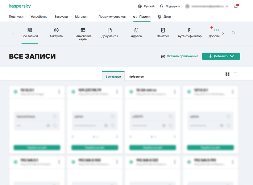 Доступны и данные авторизации, документы, карты – вся информация, добавленная в Kaspersky Password Manager. Для их просмотра придется ввести мастер-пароль. В общем, «онлайн-представительство» у Kaspersky Premium получилось полезным – в нем есть все функции, удаленный доступ к которым действительно имеет смысл.