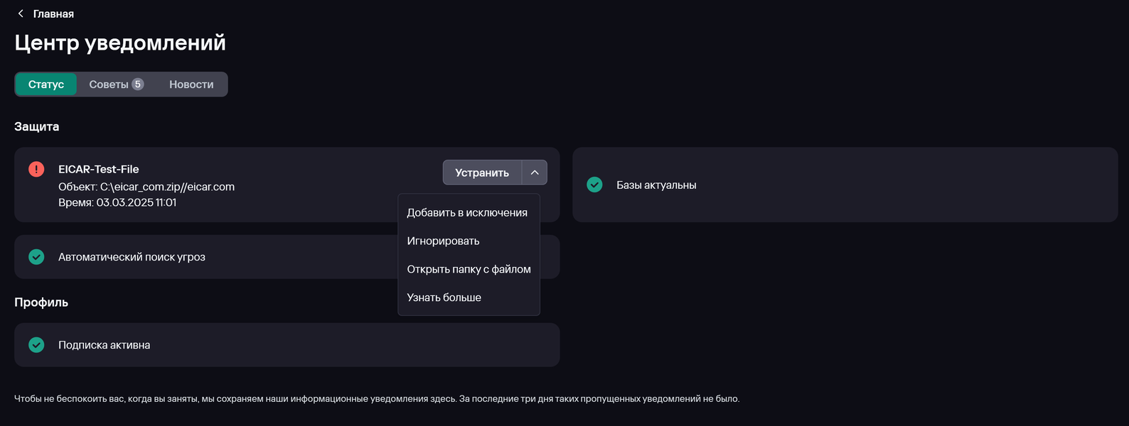 Все, что касается безопасности, собрано на соответствующей вкладке. Сюда тоже иногда нелишним будет заглядывать, но уже опционально. А если будут проблемы – сообщение о них появится на главном экране. Несмотря на это, возможность запустить проверки вручную или принудительно обновить базы (автоматическое обновление происходит каждые два часа) крайне важна – если не для самого пользователя, то для профессионалов, к которым он может обратиться. Еще раз отметим, что сделать это можно удаленно – такая возможность входит в подписку.