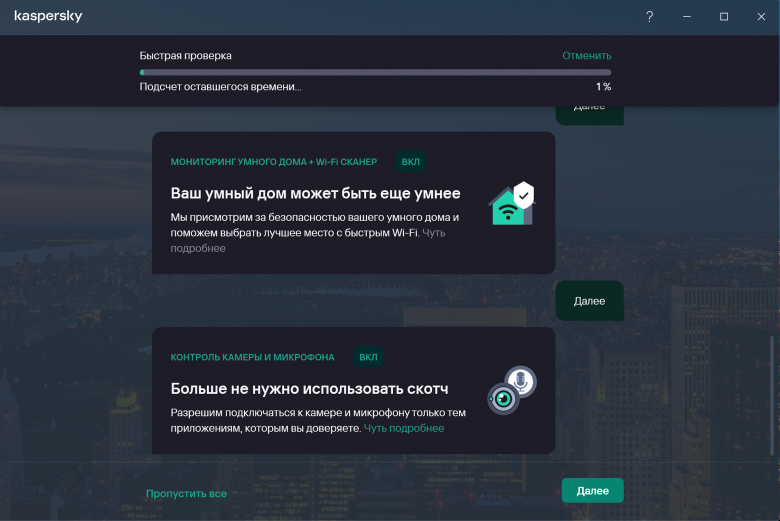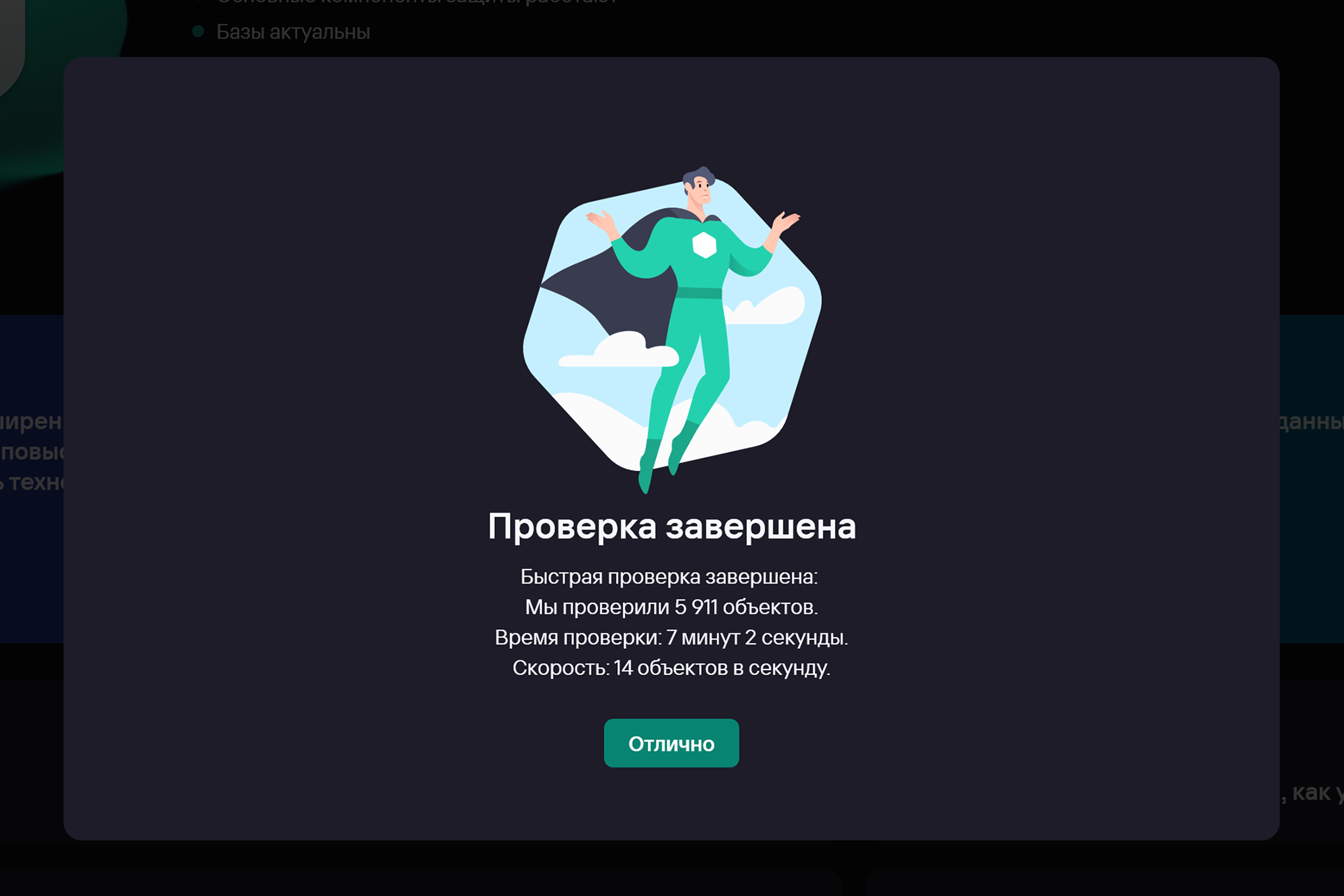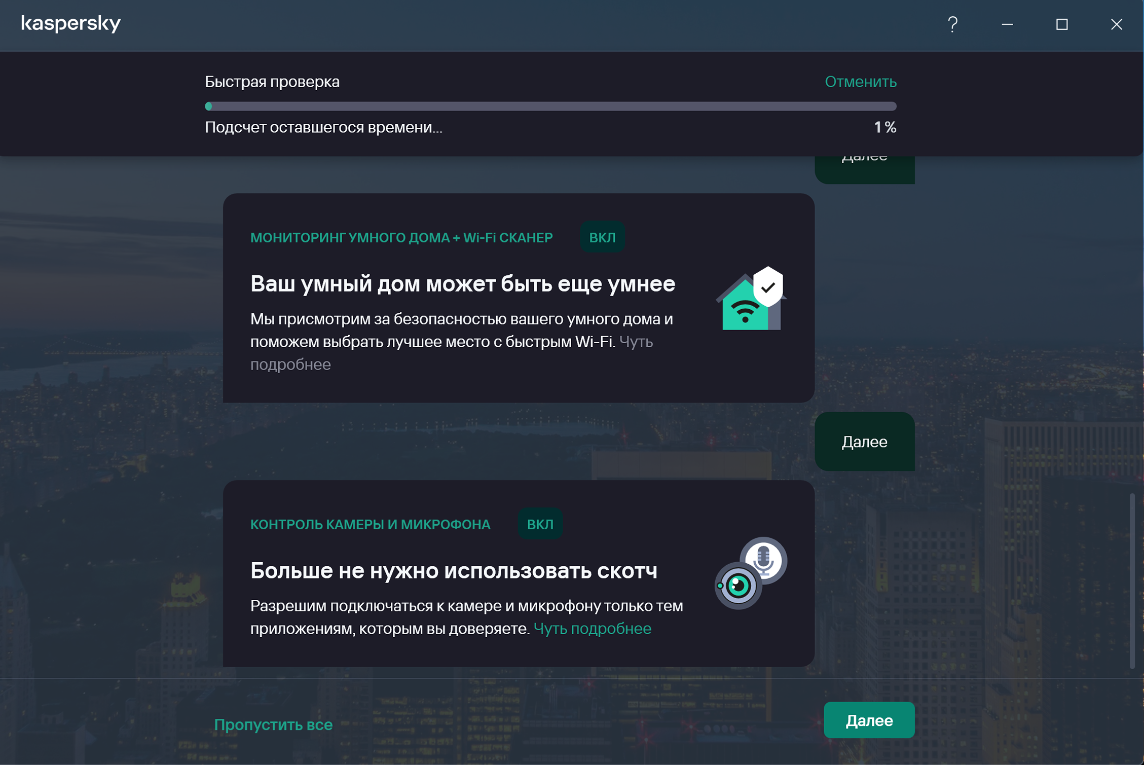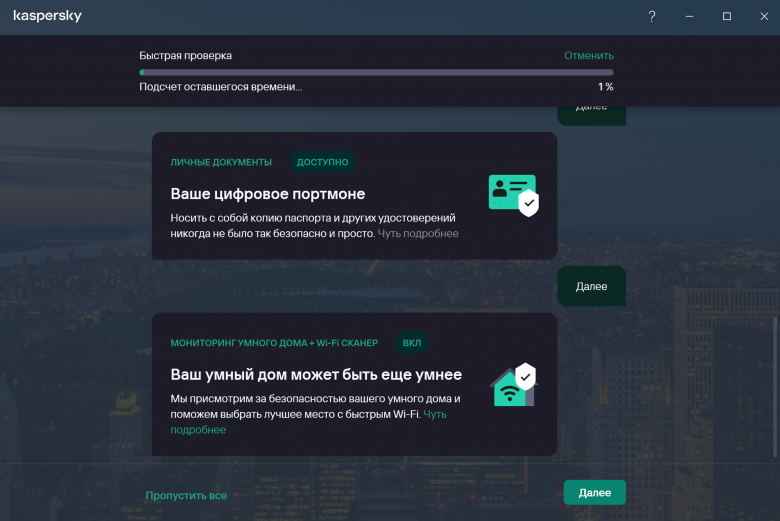 Быстрая проверка идет в фоновом режиме, параллельно можно продолжать пользоваться ПК. Долго ждать ее окончания при этом не придется – времена, когда после запуска даже «быстрой» проверки можно было спокойно удалиться пообедать, а то и поспать, давно прошли. В нашем случае она заняла всего 7 минут. Приложение предлагает потратить это время на первичную настройку, процесс которой оформлен в виде чата – так оно проще и понятнее, специальные навыки не потребуются.