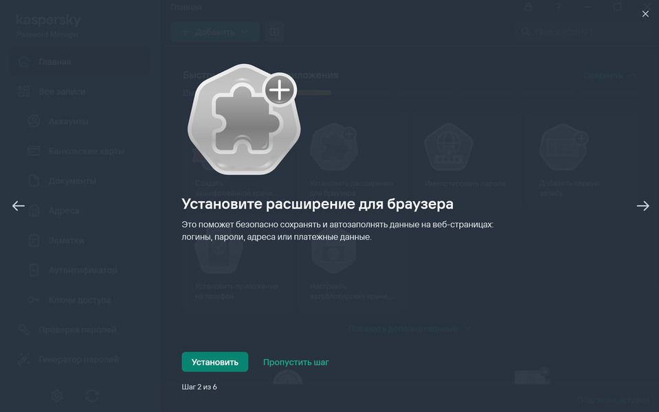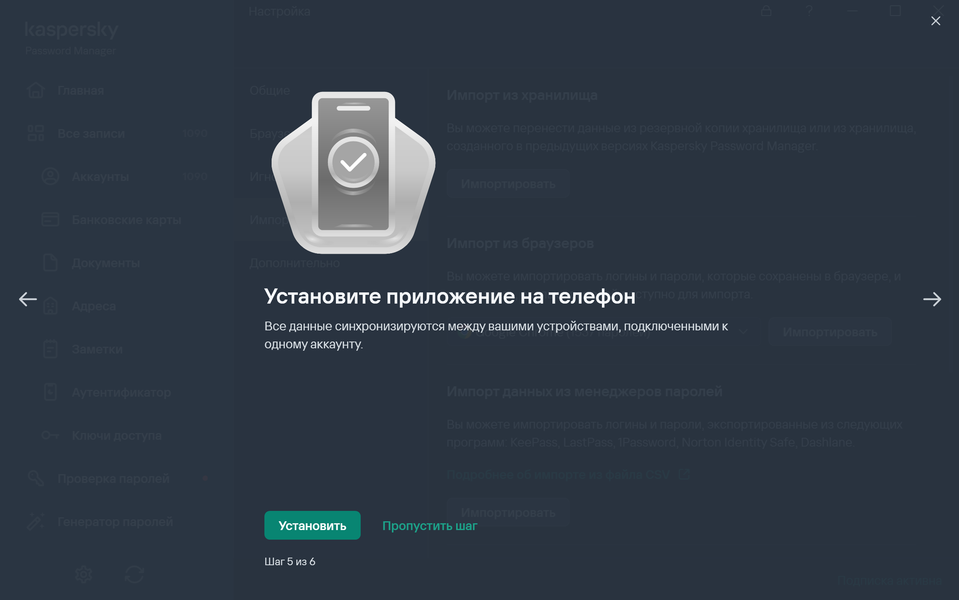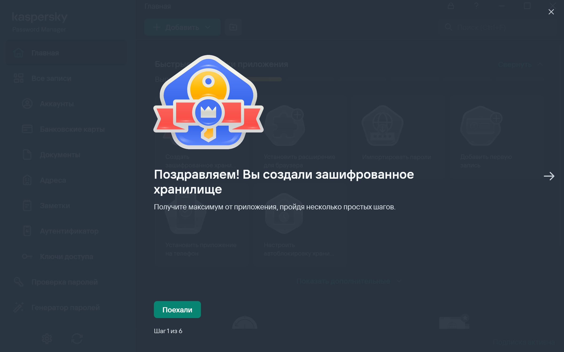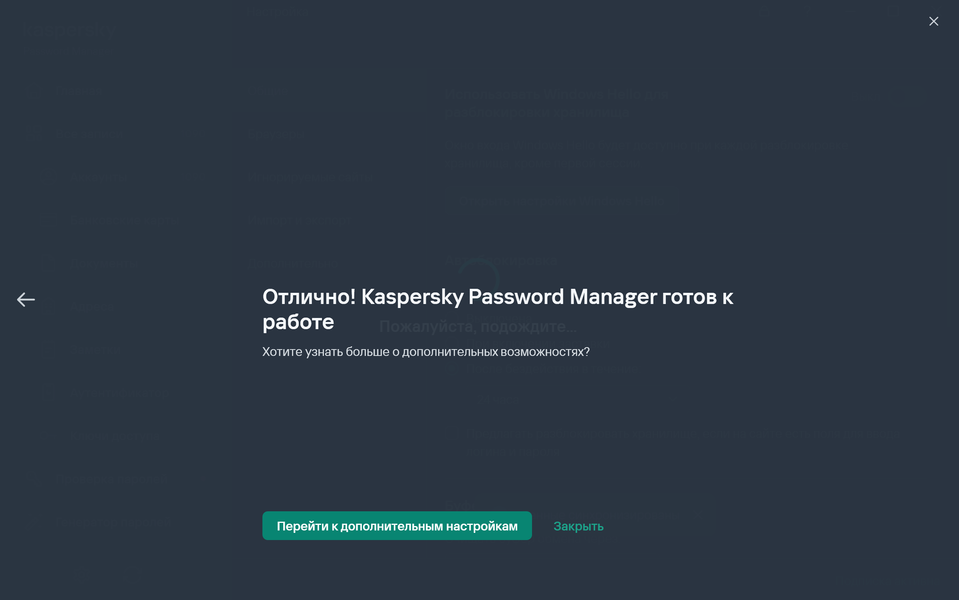 Как мы могли убедиться выше, Kaspersky Premium – далеко не только антивирус. Аналогично и Kaspersky Password Manager – не только менеджер паролей, в нем собраны несколько опций, касающихся приватности пользователя. Существуют версии как для ПК, так и для мобильных гаджетов. Процесс первоначальной настройки стартует сразу после инсталляции. Первым делом нужно придумать мастер-пароль (самый главный пароль) для защищенного хранилища. К этому процессу необходимо подойти максимально ответственно: мастер-пароль должен быть сложным, но при этом легко запоминаться – восстановить его не получится даже обратившись в поддержку «Лаборатории Касперского».