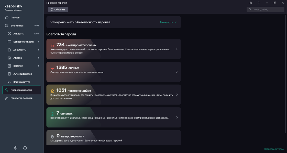 Для проверки паролей есть отдельная страница, где все они сгруппированы в несколько классов – от требующих незамедлительного внимания до тех, которые стоит изменить не прямо сейчас, а вернуться к этому вопросу как-нибудь на досуге.