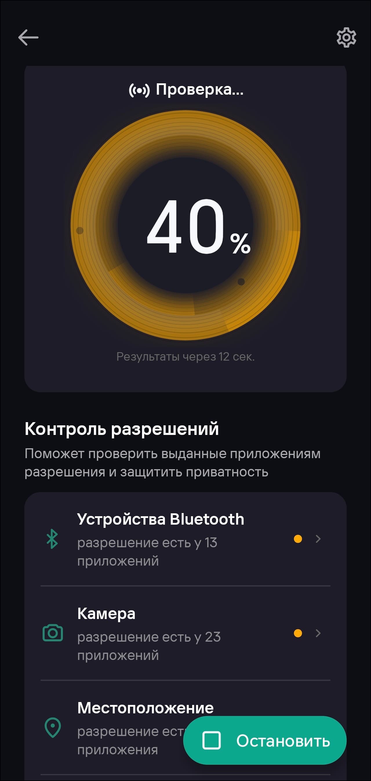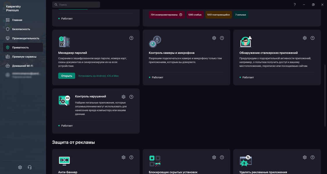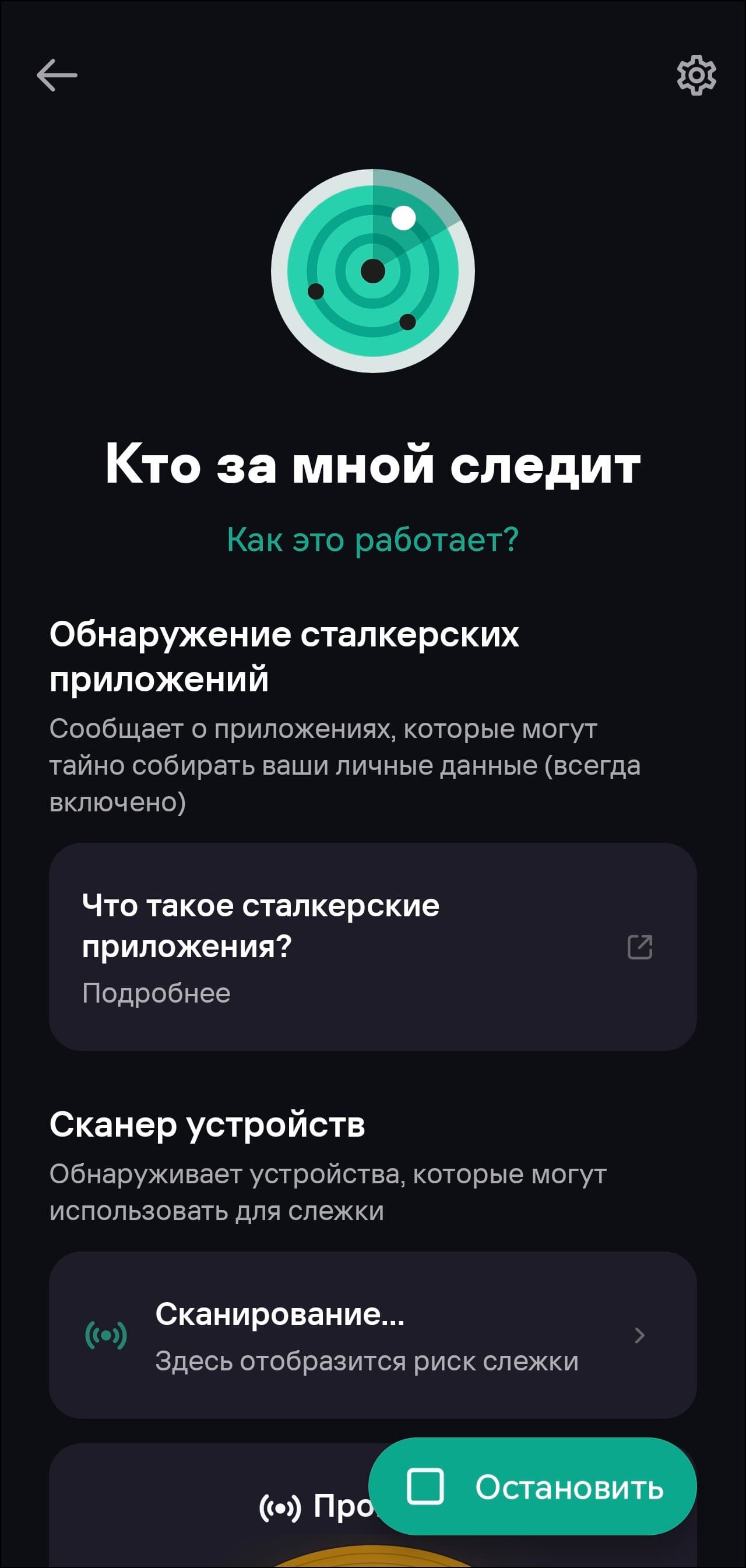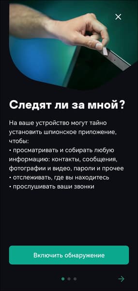 Опций тут много, каждая интересна по-своему. Например, при входе на определенные сайты может запускаться специальный защищенный браузер, в котором безопасно проводить платежи. Также реализовано сканирование на наличие сталкерских приложений и даже контроль нарушений со стороны легитимного ПО, которое злоумышленники могут использовать в своих целях.