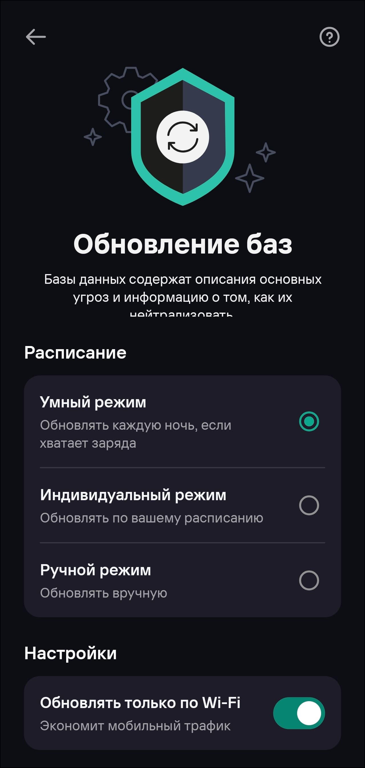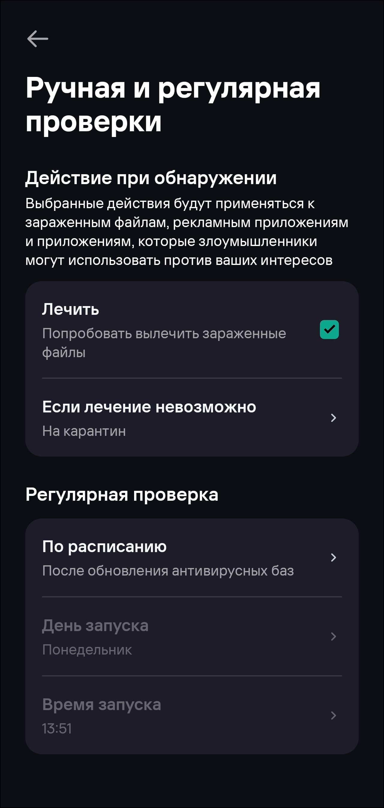 Защитное решение для мобильных устройств мы будем разбирать на примере его Android-версии, в которой также имеется все необходимое – в частности, регулярное сканирование файлов. Действия при обнаружении нежелательного ПО, режим обновления баз и прочие параметры гибко настраиваются.