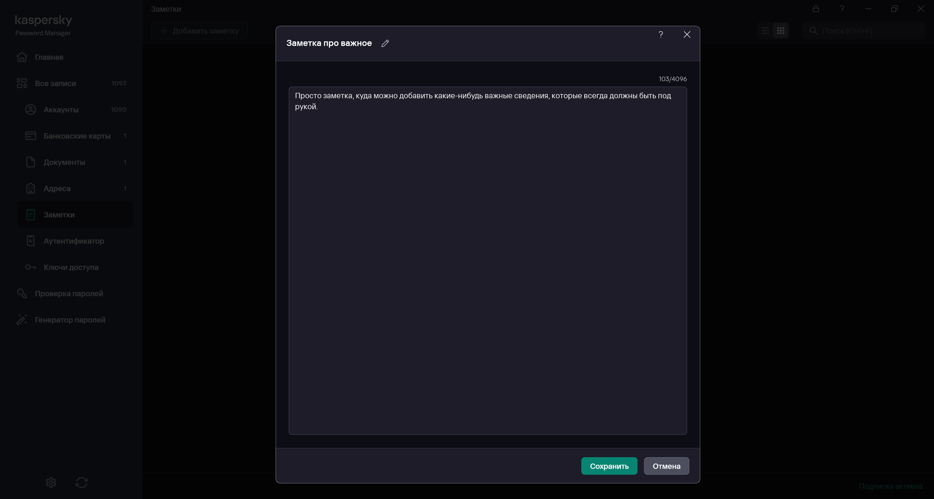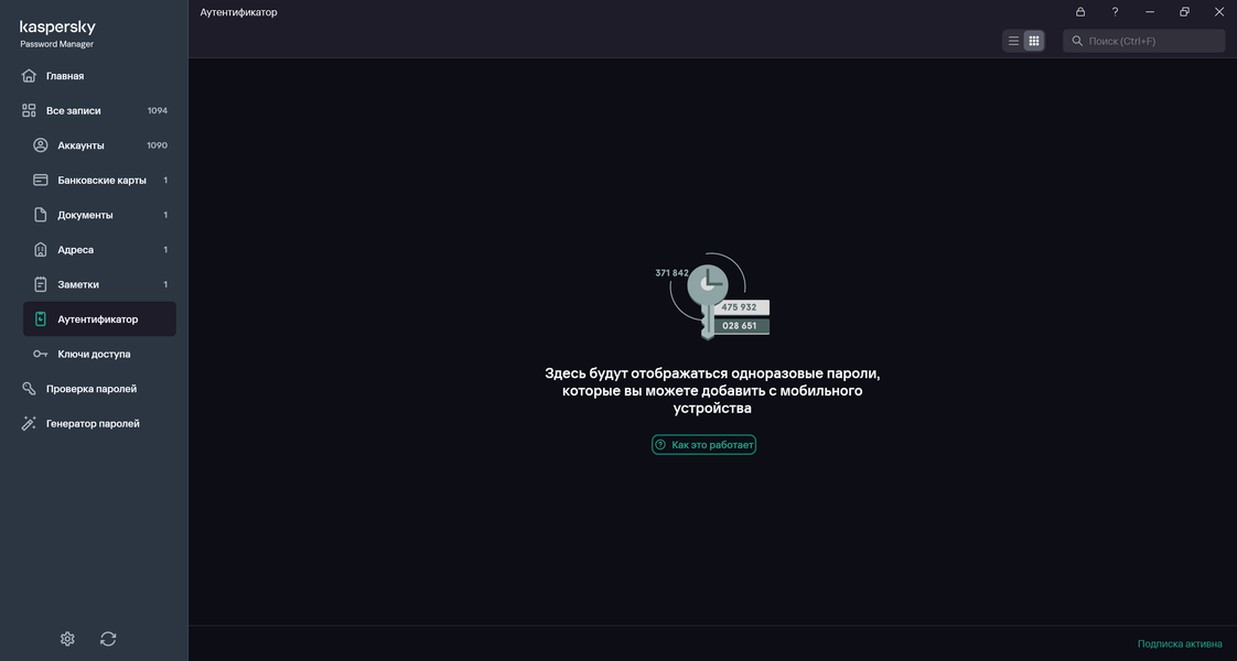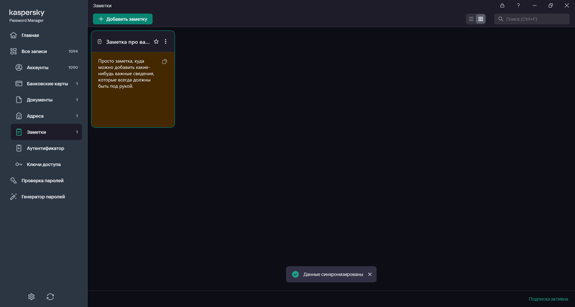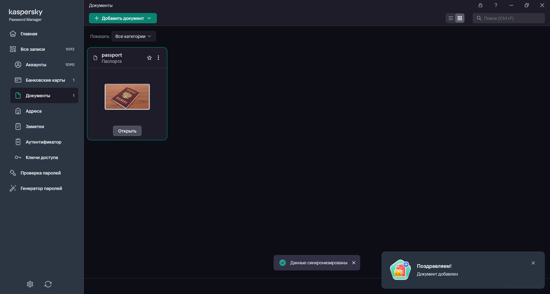 В Kaspersky Password Manager синхронизируются не только данные аккаунтов, но и добавленные документы, банковские карты и заметки – все всегда будет под рукой. Система хранения и подстановки паролей после первоначальной настройки работает на всех устройствах, где установлен Kaspersky Password Manager, в том числе – на мобильных гаджетах, где необходимые поля автоматически заполняются в браузере и приложениях. Разблокировка доступа может осуществляться без ввода пароля – с помощью отпечатка пальца, что намного быстрее и удобнее. Скриншотов на этот раз не будет – приложение Kaspersky Password Manager блокирует их создание из соображений безопасности.