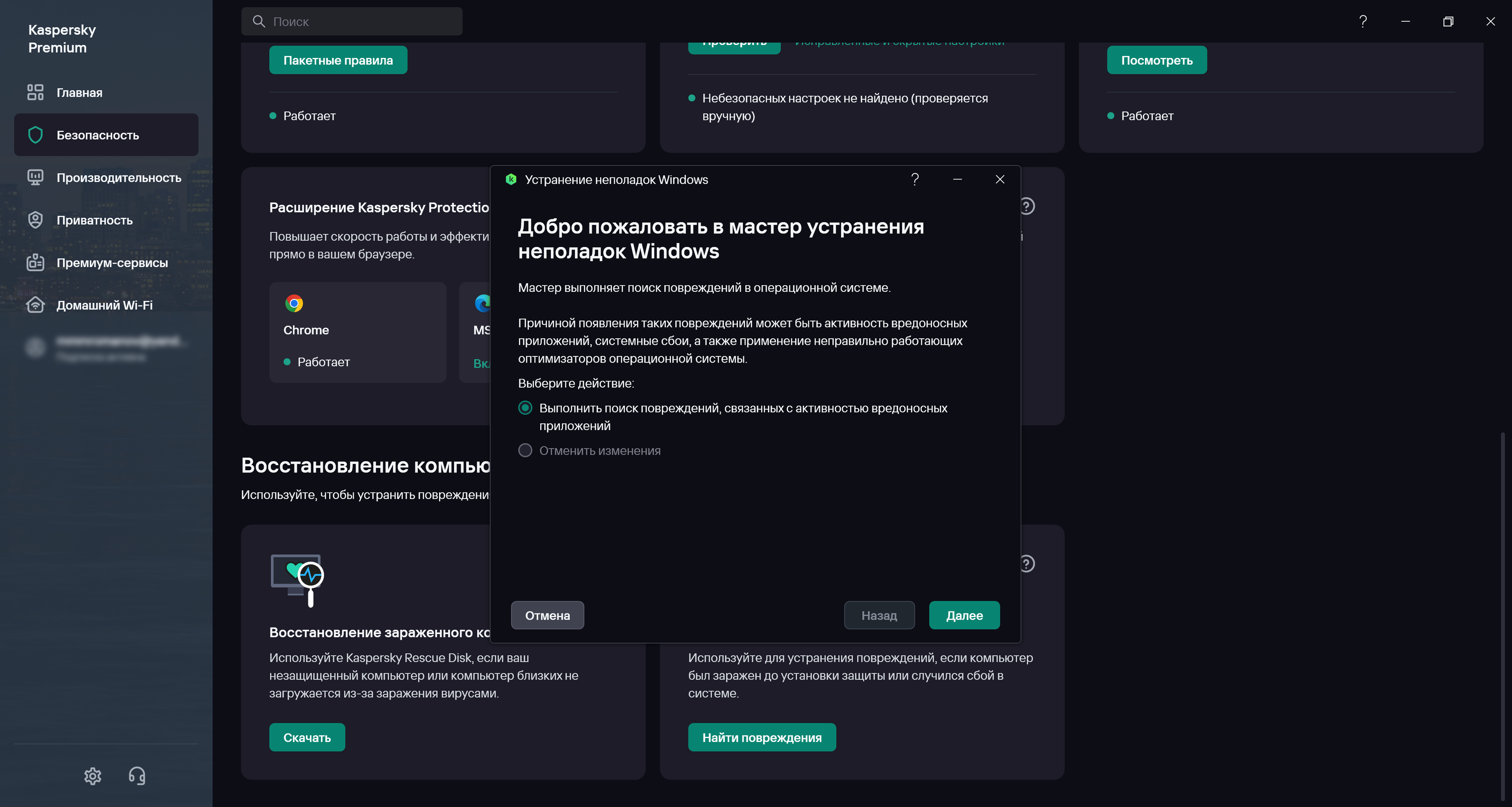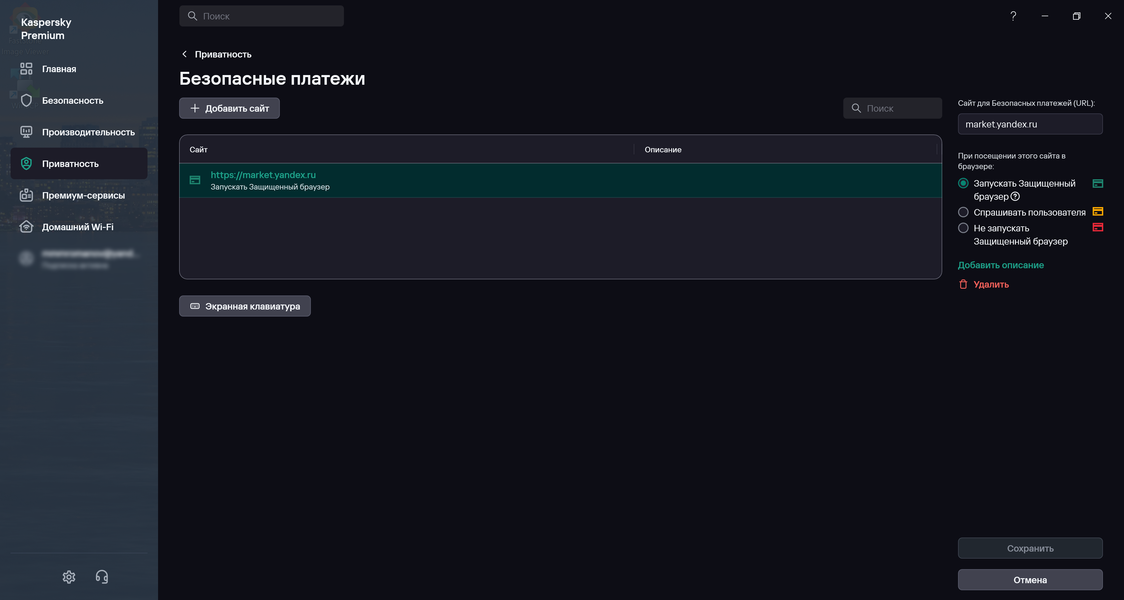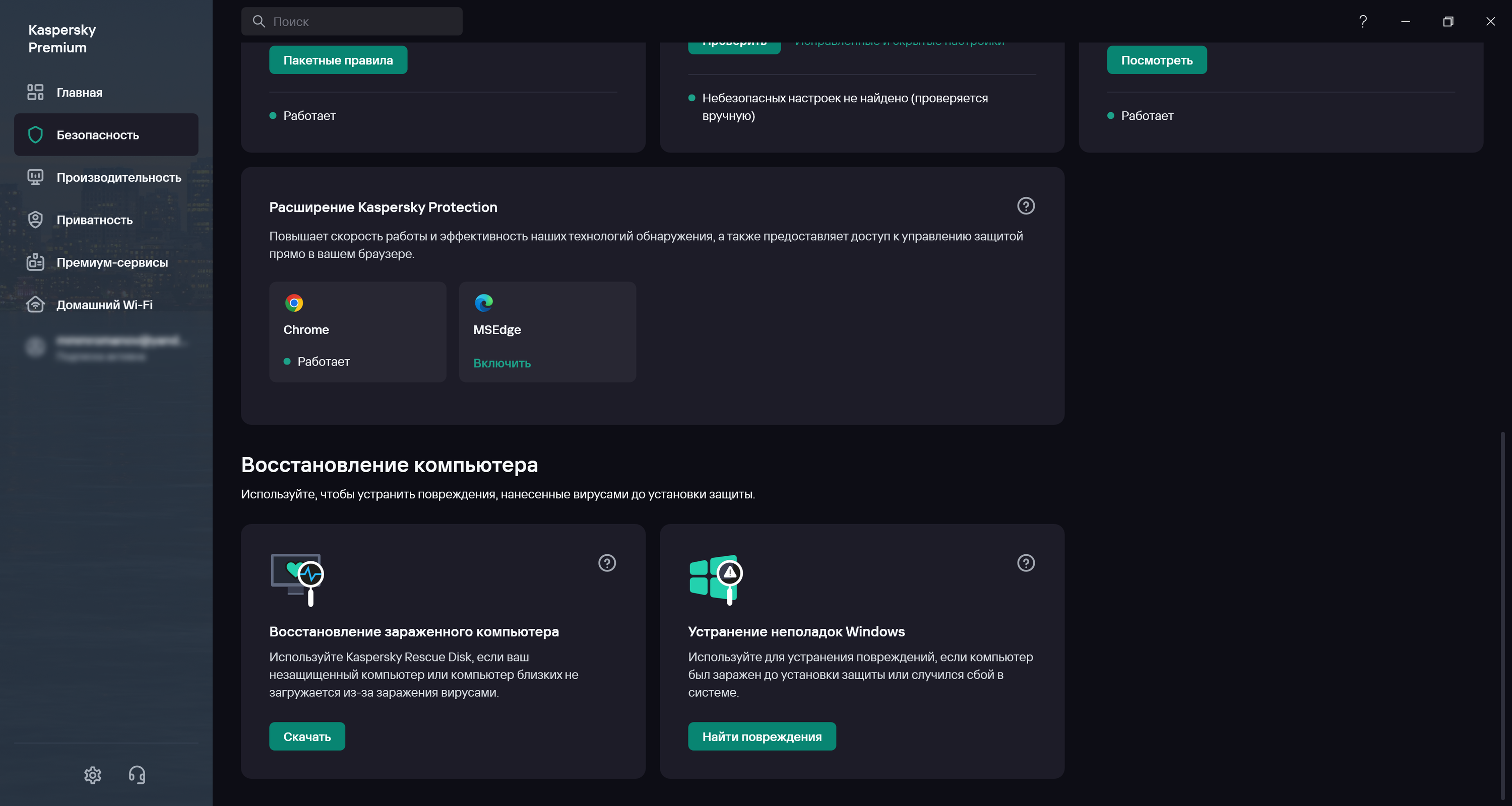 После первичной настройки решение уже не просто готово к работе, а активно ее делает. Отдельно нужно сказать про расширения для браузеров, которые тоже нелишним будет установить – ссылки есть в настройках Kaspersky Premium. Решение обеспечивает безопасный серфинг в интернете: например, предупреждает о переходе на потенциально опасные сайты.