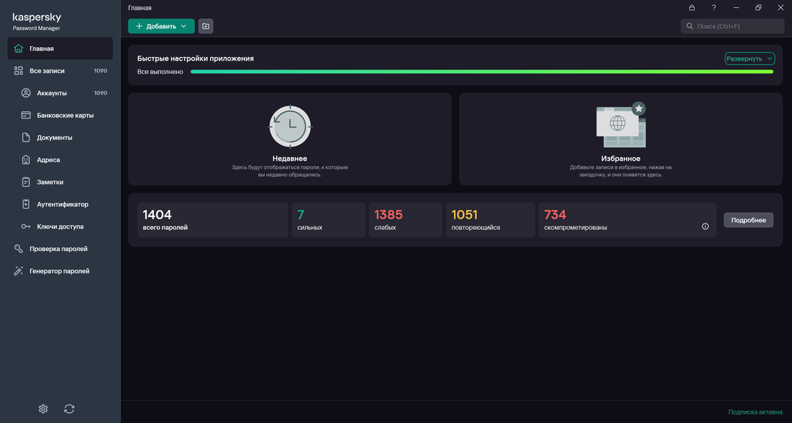 На главной странице приложения размещены модули с самой важной информацией – от последних паролей и избранных записей до различных опций, которыми предлагается воспользоваться.