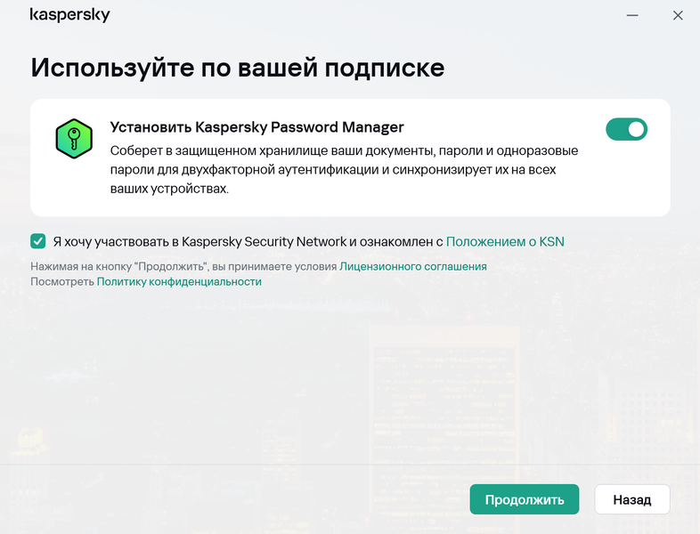 Скачиваем инсталлятор, запускаем. Процесс установки происходит в формате диалога, что помогает настроить защиту даже совсем неопытным пользователям. Параллельно инсталлятор предлагает установить менеджер паролей (Kaspersky Password Manager) — нет смысла отказываться, штука полезная.