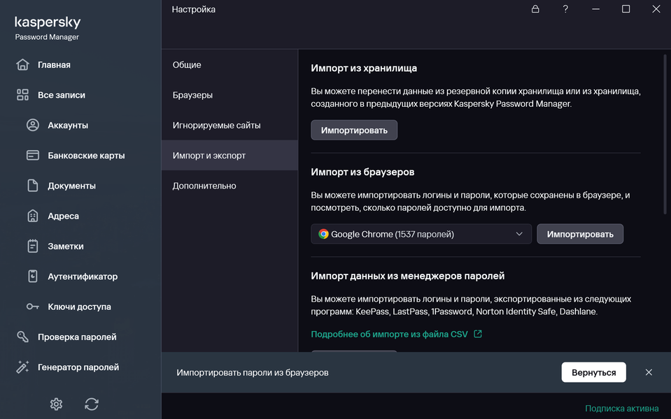 Если в браузере уже есть список сохраненных паролей, импортируем его в приложение. Мы сознательно ввели при регистрации старый и давно не используемый для авторизации в важных сервисах адрес электронной почты, для которого сохранено множество паролей. Так будет намного нагляднее, особенно в момент, когда мы дойдем до проверки надежности паролей и утечек данных.