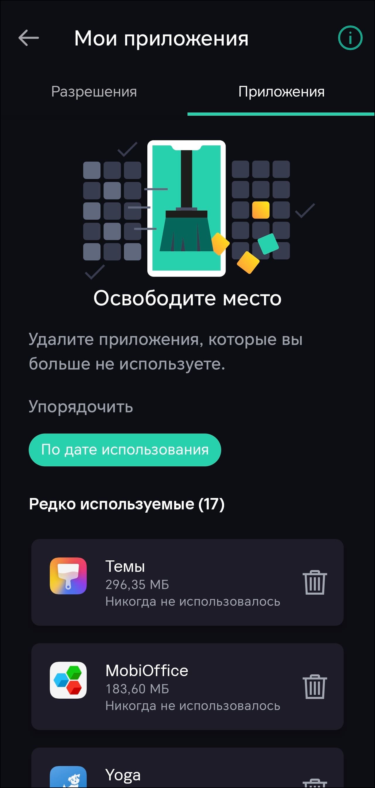 К контролю утечек данных мы еще неоднократно вернемся – можно проверить их наличие и из приложения для мобильных устройств. Как уже отмечалось выше, многие ключевые возможности доступны как для компьютеров, так и в мобильных приложениях. Программа сама напомнит о том, что те или иные приложения имеют доступ к конфиденциальным данным. Периодически стоит проверять список и отзывать ненужные разрешения. На отдельной вкладке собраны редко используемые программы, которые можно удалить для экономии места в памяти.