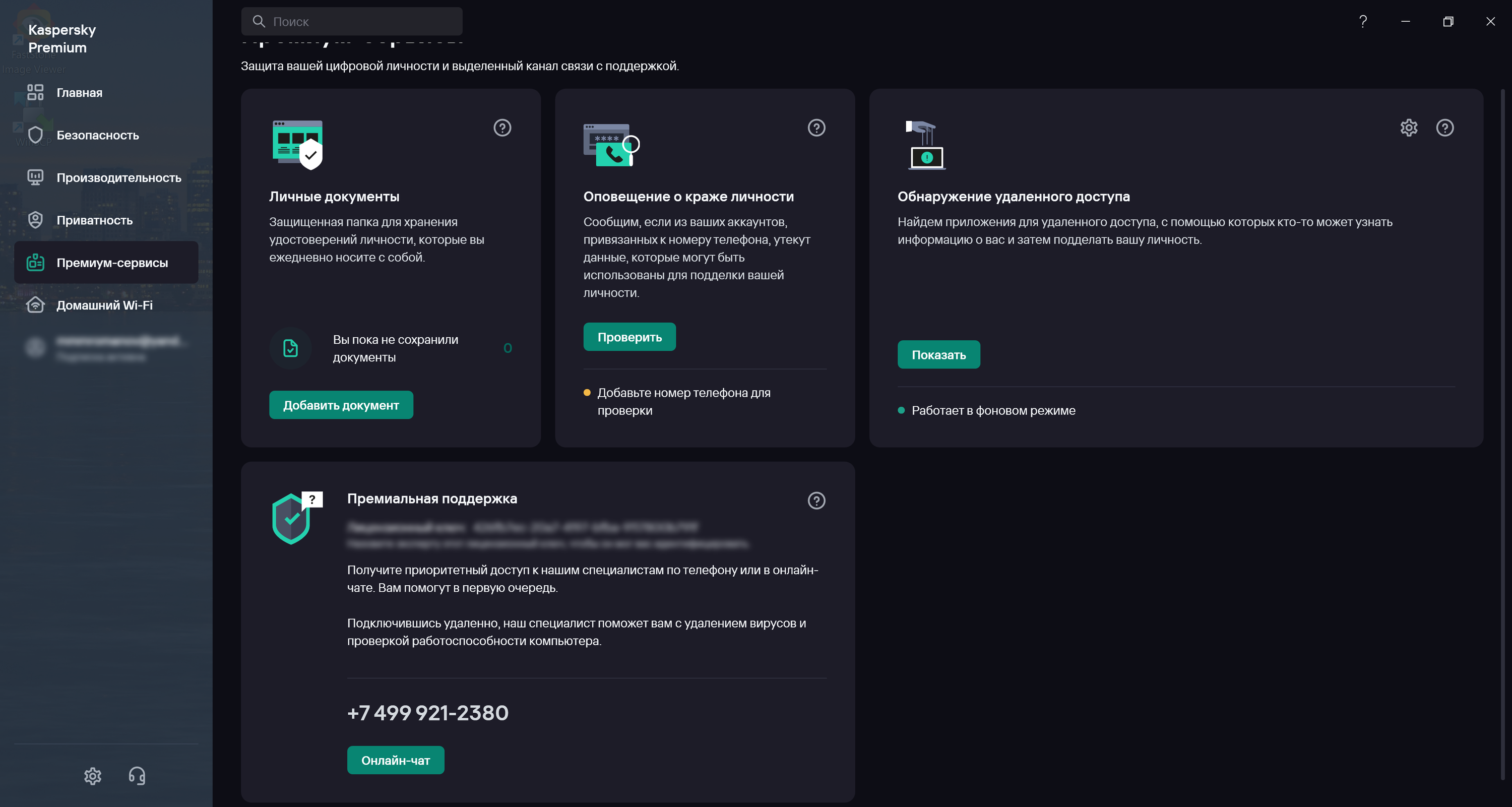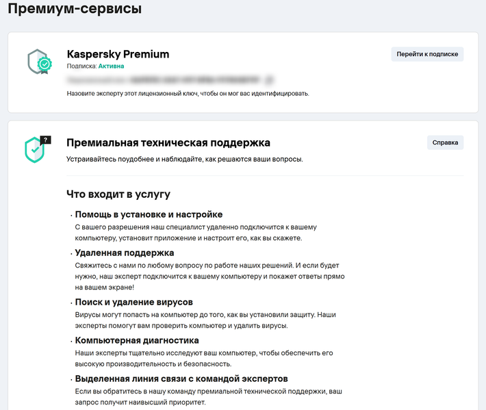 Совсем-совсем неопытные пользователи ПК могут воспользоваться премиум-сервисами, доступными в подписке. Можно позвонить по телефону, после чего специалисты помогут организовать удаленный доступ к ПК, подключатся, все поставят и настроят, проведут первичное сканирование на наличие киберугроз.